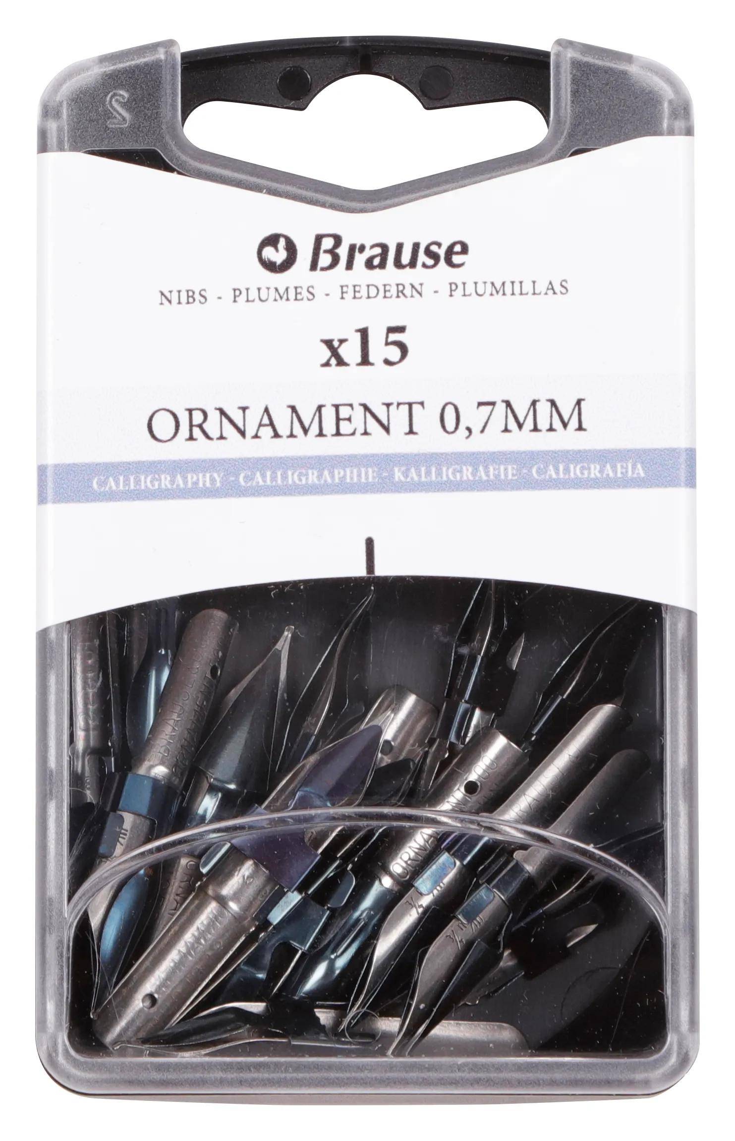 Schachtel mit 15 Ornamentfedern Ornamentfeder mit Überfeder und Reservoir, wird hauptsächlich für Überschriften und Ornamente verwendet. Brause ist seit 1850 Spezialist für Kalligrafiefedern, Zeichenfedern und Schreibfedern. Hergestellt in Deutschland.