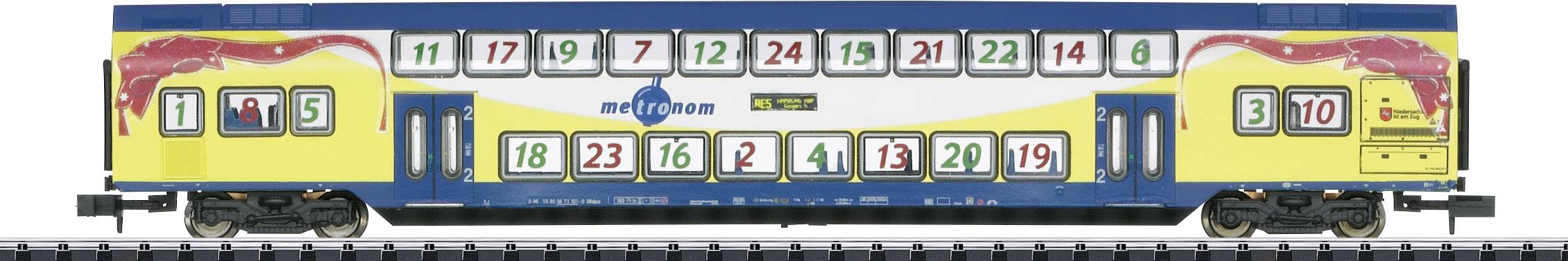 Doppelstockwagen 2. Klasse, Bauart DBdpza der Metronom Eisenbahngesellschaft mbH (metronom). In der Ausführung während der Adventszeit 2011 und 2012 als "Adventskalender".