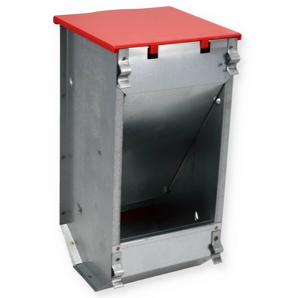 Futterautomat aus verzinktem Blech mit einem Fassungsvermögen von ca. 1 Kg. Der Futterautomat lässt sich an der Tür oder innerhalb des Stalls anbringen.