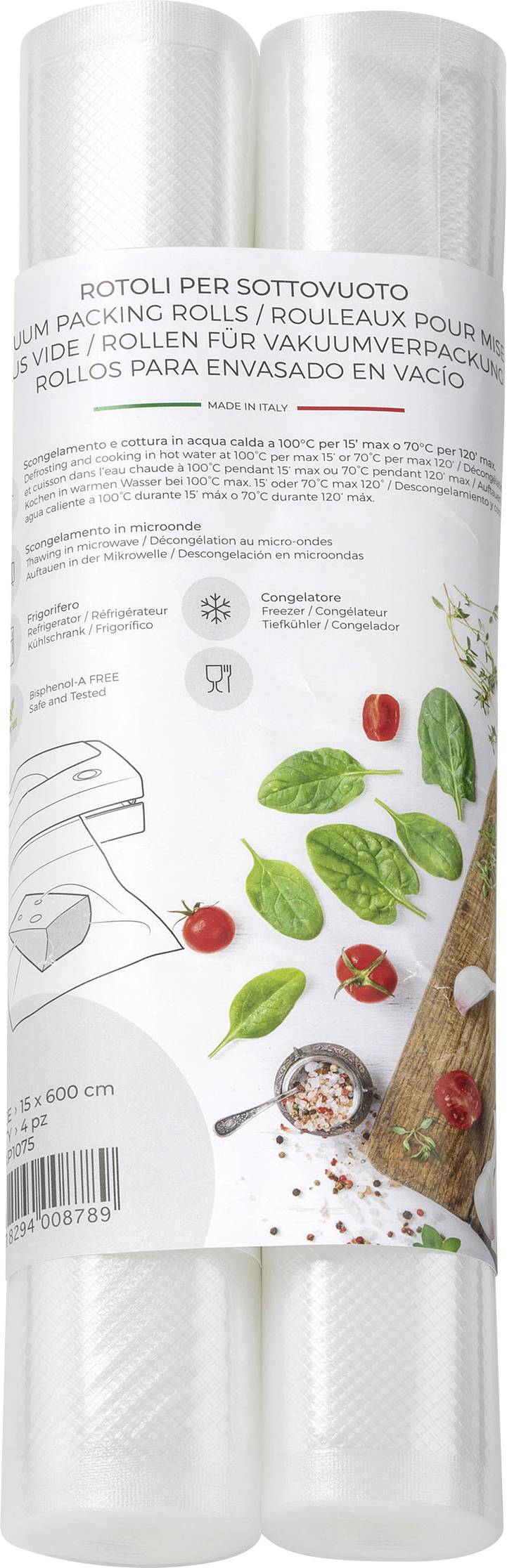 Maße: 15 x 600 cm, 4 Rollen; Hochwertige Vakuumierrollen; BPA-frei und lebensmittelsicher; Geeignet für Kühlschrank, Gefrierschrank und Mikrowelle; Verwendbar zum Kochen in heißem Wasser bis zu 100°C; Ideal für Sous-Vide-Gerichte; Individuell zuschneidbar; Auch in weiteren Größen erhältlich