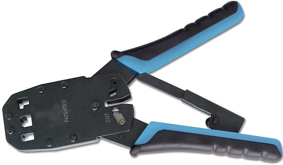 Diese universell einsetzbare Crimpzange ist für RJ11/RJ12, RJ45 und DEC Steckverbinder geeignet. Die Zange besitzt einen integrierten Kabelschneider und Abisolierer, der auch für UTP- und STP-Kabel geeignet ist.