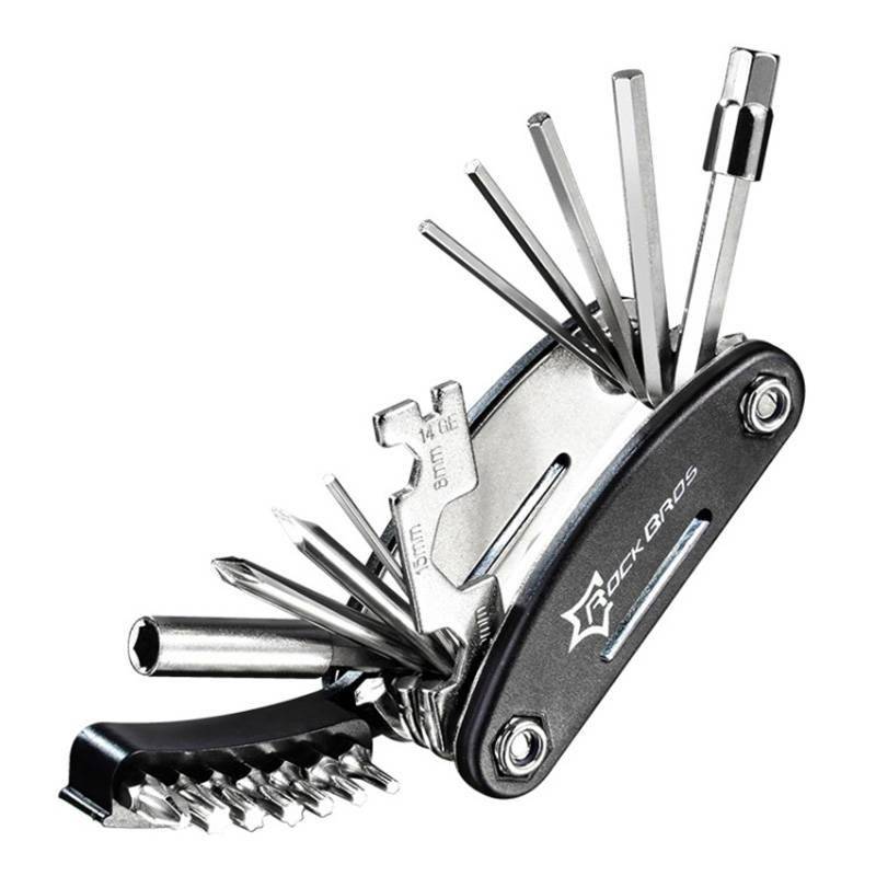 Wenn du das Rockbros GJ8002 Taschenmesser kaufst, bekommst du bis zu 16 verschiedene Werkzeuge. Das Multitool bietet einen Steckschlüssel mit einem Satz Steckschlüssel (PH2, T30, T27, T25, T20, T15, T10), einen Kreuzschlitzschraubendreher, einen Schlitzschraubendreher, einen Satz Schraubenschlüssel (8mm, 10mm, 15mm) und Innensechskantschlüssel (1mm, 2mm, 3mm, 4mm, 5mm, 10mm). So kannst du jederzeit eine lockere Schraube festziehen oder einen kleinen Fehler beheben!