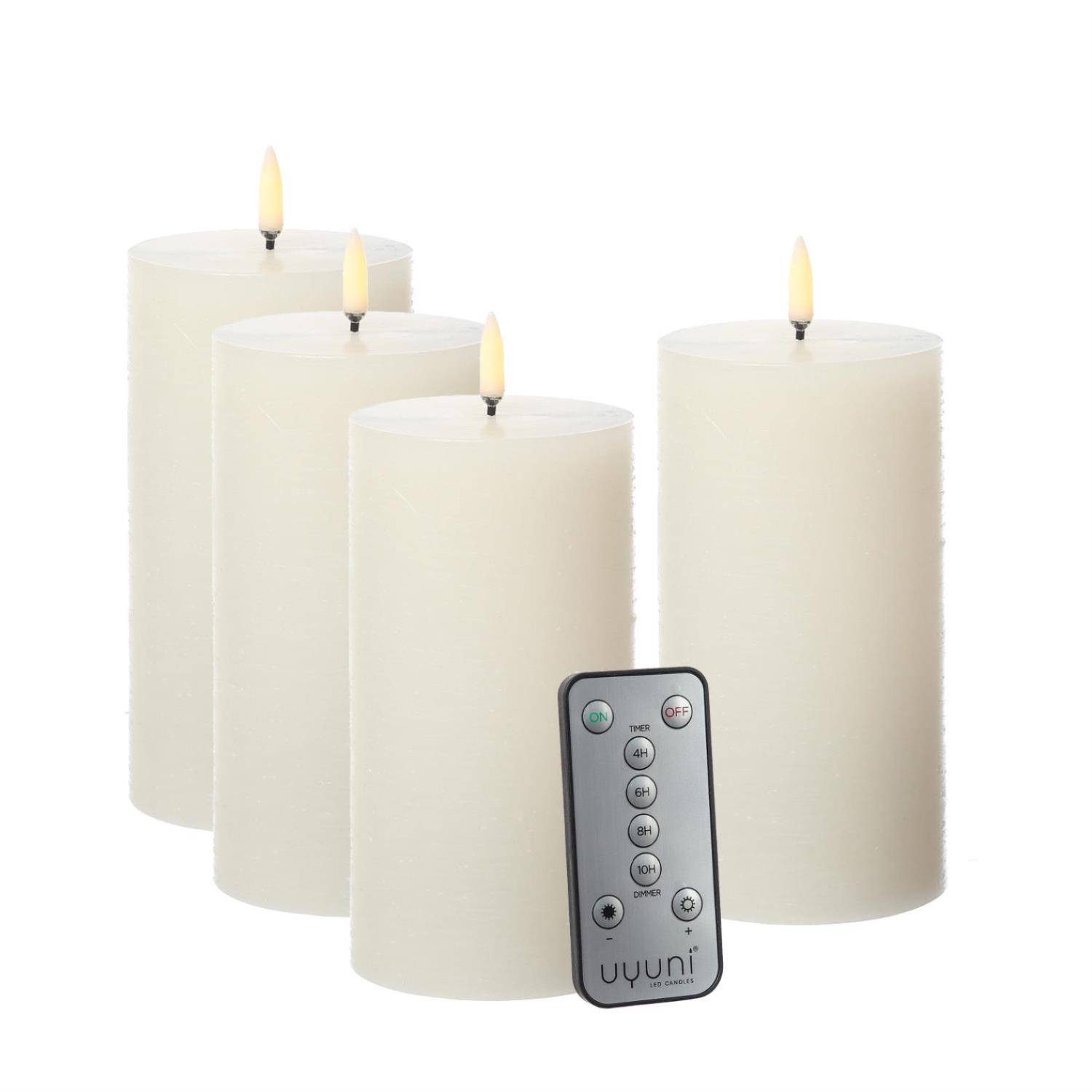 Wunderschönes Set aus 4 LED Echtwachskerzen in Creme - perfekt für einen Adventskranz oder eine hüsch dekorierte Schale zur Adventszeit.Uyuni LED-Kerzen bieten eine noch realistischere Flamme, die weiches, warmes Licht mit einem zarten Flackern erzeugt und kaum von einer echten Kerzenflamme zu unterscheiden ist.Das 4er Set wird mit einer praktischen Fernbedienung geliefert über die auch 4, 6, 8 oder 10 Stunden Timer aktiviert werden können. So leuchten die Kerzen im Automatikbetrieb.Die Oberfläche dieser Premiumkerzen ist im Rustik Design produziert. Sie zeigt eine schöne Struktur und lässt das Licht und Schattenspiel besonders lebendig wirken.Dekoriere nach Herzenslaune mit diesem eleganten 4er Set LED Weihnachtskerzen. Machs Dir besonders gemütlich und genieße das romantisch leichte Flackern.