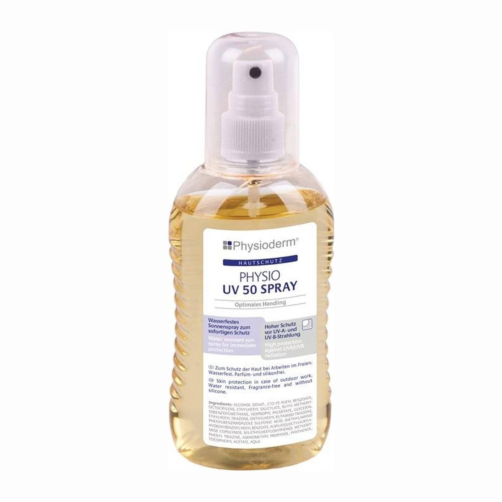 wasserfestes, transparentes Sonnenspray zum sofortigen Schutz vor hoher natürlicher UV-Strahlung bei Arbeiten im Freien UV-A Lichtschutzfaktor beträgt 26 mit Überkopfpumpe für schlecht erreichbare Körperstellen, wie dem Rücken fettfreie Formulierung speziell für den Schutz von großen Körperflächen und behaarten Hautpartien bei mittlerer bis sehr hoher natürlicher UV-Strahlung einsetzbar mit Vitamin E feuchtigkeitsspendend wasserfest parfümfrei fettfrei Anwendung: vor Gebrauch gut schütteln, vor dem Sonnenaufenthalt aus 20-30 cm Entfernung gleichmäßig und großzügig auf die Haut aufsprühen und ggf. verreiben, mehrfach auftragen, insbesondere beim Schwitzen Merkmale Ausführung: wasserfest, fettfrei Eigenschaft: Vorbeugung gegen Sonnenbrand Gebinde: Pumpflasche