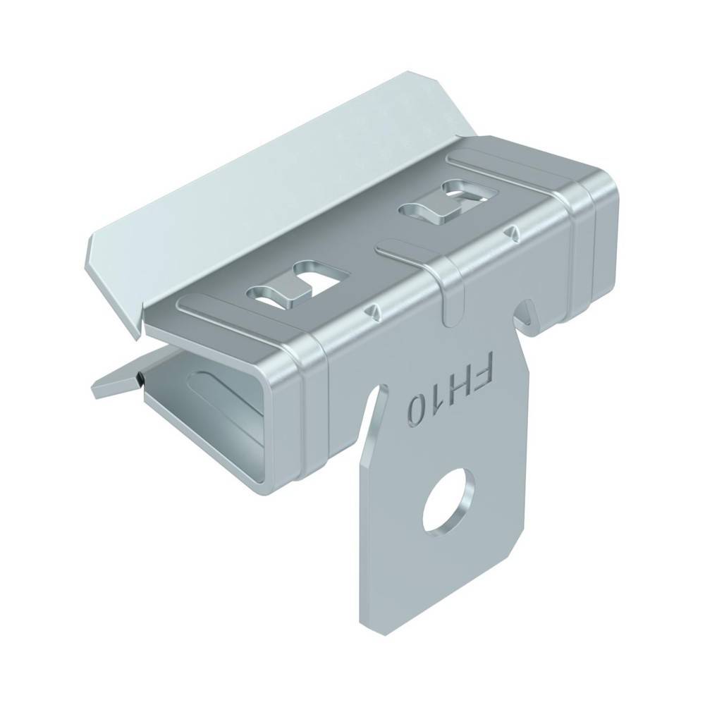 Trägerklammer mit Bohrung für individuelle Montagelösungen, z. B. für die Aufnahme von S-Haken oder Ketten. Befestigung an Stahträgern durch Aufschlagen.
