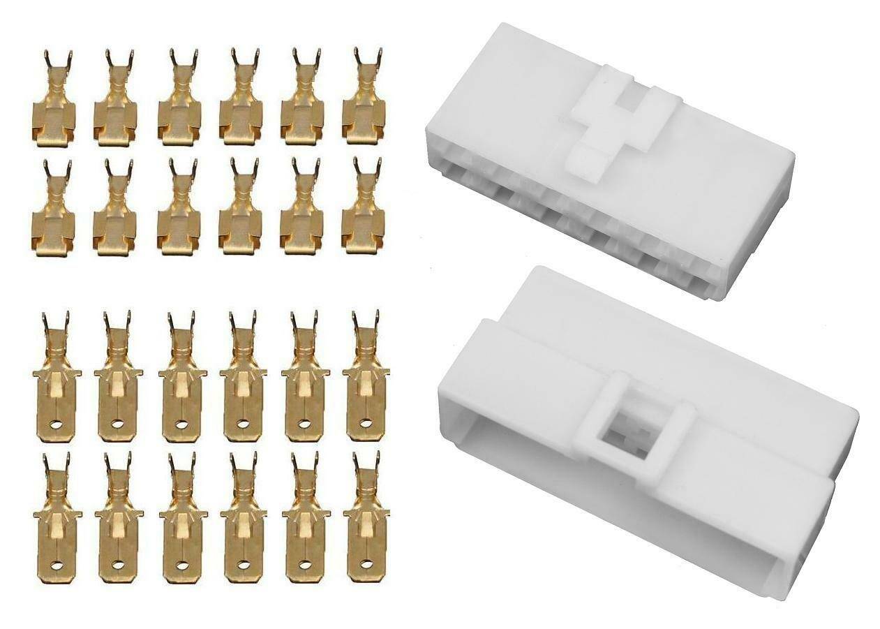 Set mit 10 Steckergehäusen und 10 Buchsengehäusen. Inklusive Flachsteckhülsen und Flachsteckern mit Rasterzunge. Die Ausführung 2,8 mm wird häufig bei Motorrädern, Rollern, ATV und Quads eingesetzt. Die Ausführung 6,3 mm wird vor allem in PKW und LKW verwendet.