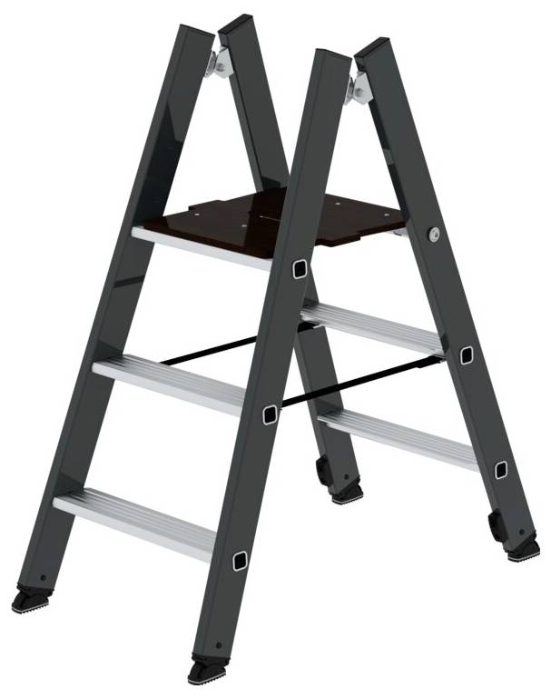 Klappbarer Tritt aus Aluminium. Plattform aus Holz-Siebdruck. Stabile Rechteckrohr Holme in RAL 7016 pulverbeschichtet. 80 mm tiefe, geriffelte Stufen. Große Standfläche (310 x 385 mm) mit integriertem Griffloch. Optional mit Einhängeplattform erweiterbar (zweiter Klapptritt erforderlich). Konische Holmführung für einen sicheren Stand. Spreizsicherung mit zwei hochfesten Polyestergurten. Leicht im Transport, platzsparend in der Aufbewahrung (nur 208 mm tief). Stufenabstand 235 mm. nivello® Leiterschuhe mit patentierter 2-Achsen-Neigungstechnik. Maximale Belastung: 150 kg