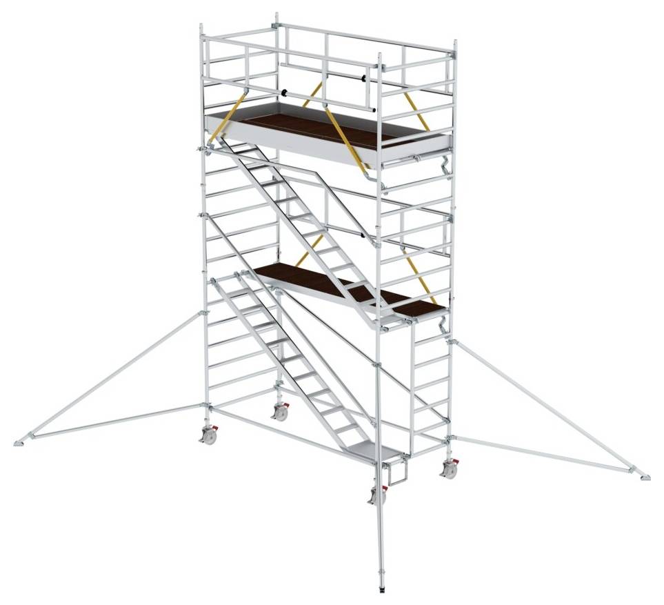 Rollgerüst aus stabilem Aluminium-Rundrohr mit geschweißten Rahmenteilen. Dank vorlaufenden Geländern rundum gesichert, von Ebene zu Ebene auf- und abbaubar. Schrägaufstiege von Plattform zu Plattform mit 100 mm tiefen, geriffelten Aluminiumstufen und Handlauf für den sicheren Auf- und Abstieg. Alle Gerüstteile sind auch einzeln als Ersatz- oder Erweiterungsteile erhältlich. Stabil und flexibel durch klappbare Ausleger. Ideal auch für den wandseitigen Aufbau oder das Verfahren in engen Gängen. Zugang durch Öffnung im Einstiegsrahmen. Vier Lenkrollen Ø 200 mm mit zentrischer Lasteinleitung, Feststellern und Spindeln. Großformatige Arbeitsfläche mit 1,35 m Breite. Aluminium-Bordbretter und Geländerrahmen mit integrierter Knieleiste zur Absturzsicherung. Werkzeugloser Auf- und Abbau von Plattform zu Plattform dank Steckverbindungen und Schnellverschlüssen. Geringes Gewicht der Einzelteile für ein einfaches Handling. Unterschiedliche Plattformlängen erhältlich (1,80 / 2,45 / 3,0 m). Arbeitshöhen bis 12,35 m. GS-geprüft nach DIN EN 1004. Lastklasse/Gerüstgruppe 3: 2,0 kN/m²