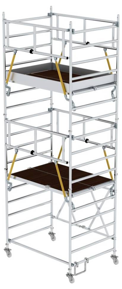 Rollgerüst aus stabilem Aluminium-Rundrohr mit geschweißten Rahmenteilen. Dank vorlaufenden Geländern rundum gesichert, von Ebene zu Ebene auf- und abbaubar. Alle Gerüstteile sind auch einzeln als Ersatz- oder Erweiterungsteile erhältlich. Klapprahmen aus Rechteckrohr-Holmen mit selbstarretierenden Scharnieren. Platzsparend bei Transport und Lagerung. Vier Lenkrollen Ø 125 mm mit zentrischer Lasteinleitung und Spindeln. Trittsichere Plattform für festen Stand. Aluminium Bordbretter und Geländerrahmen mit integrierter Knieleiste zur Absturzsicherung (ab Plattformhöhe 2,8 m). Einfacher Auf- und Abbau ohne Werkzeug. Unterschiedliche Plattformbreiten erhältlich (0,75/1,35 m). Plattformlängen 2,45 m und 3,0 m auf Anfrage. Arbeitshöhen bis 13,88 m. GS-geprüft nach DIN EN 1004. Lastklasse/Gerüstgruppe 2: 1,5 kN/m²