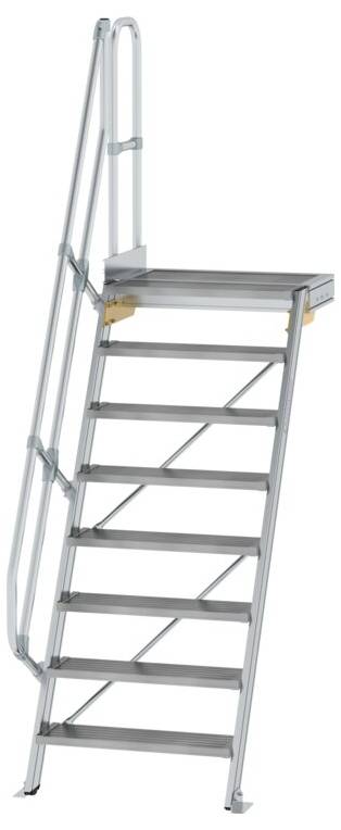 Ortsfeste Treppe mit Plattform aus Aluminium mit Neigung 60°. Stufen- und Plattformbreite: 800 mm. Plattformlänge: 460 mm. Letzte Stufe (Tiefe: 225 mm) auf gleicher Höhe wie Plattform montiert (Gesamttrittfläche: 685 mm). Stufen- und Plattformausführung standardmäßig in Aluminium geriffelt (R 9), optional auch mit anderen Belägen erhältlich. Handlauf und Geländer einseitig Ø 40 mm mit verschraubten Verbindungselementen (Höhe: 1.100 mm) serienmäßig. Zweiter Handlauf nach DIN EN ISO 14122-3 erforderlich und gegen Mehrpreis erhältlich. Untere Holmenden mit robusten Fußwinkeln zur Bodenbefestigung. Stirnseitiges Geländer gegen Mehrpreis erhältlich. Einfache Montage durch Lieferung in vormontierten Baugruppen inklusive Montageanleitung. Bei Treppen mit senkrechter Höhe ab 3.000 mm ist ein Zwischenpodest erforderlich (gegen Mehrpreis). Sofern bauseits keine Auflageflächen oder Befestigungen vorhanden sind, muss die Befestigung über eine Dreieckskonsole erfolgen. Maximale Belastung: 1,5 kN/m2, Stufenbelastung 150 kg, Gesamtbelastung 300 kg. Hinweis: Im Standard sind Verbindungsteile aus verzinktem Stahl enthalten, welche für den Innenbereich geeignet sind. Gegen Mehrpreis können diese auch in Edelstahl ausgeführt werden, was für den Außenbereich empfohlen wird