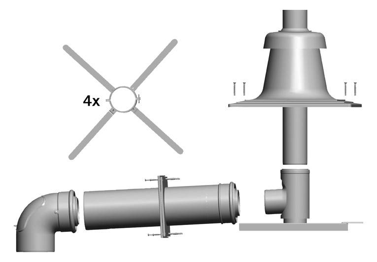 bestehend aus: Revisionsbogen bzw. T-Stück 87° konzentrisch, Rohr konzentrisch Länge 500mm, Rosette, Stützbogen 87° mit Auflageschiene, 4 Abstandhalter und Schachtabdeckung mit integrierter Luft-/Abgasführung und Mündungsstück