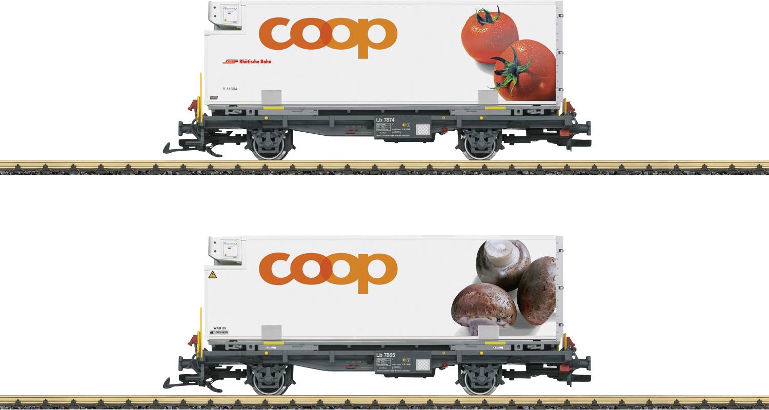 Containerwagen Set der RhB in der aktuellen Epoche VI-Ausführung. Mit diesen beiden Modellen erscheinen weitere Containerwagen mit der typischen Werbung der Handelskette “coop®“. Set mit zwei Wagen mit den Motiven Tomaten und Pilze. Wagen mit neuer Wagennummer in vorbildgerechter Umsetzung. Länge über Puffer je 41 cm.