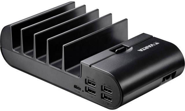 Mit der Home-Station von Varta kann platzsparend und aufgeräumt bis zu 5 mobile Geräte an einen Ort geladen werden. Somit werden nicht wichtige Steckdosen belegt und es muss nicht für jedes Gerät ein USB-Netzteil vorhanden sein. Einfach anschließen und der Ladevorgang startet automatisch. Die Kabel können in der Ladestation aufbewahrt werden. Zahlreiche Sicherheitsmechanismen sorgen für ein sicheres und schonendes laden.