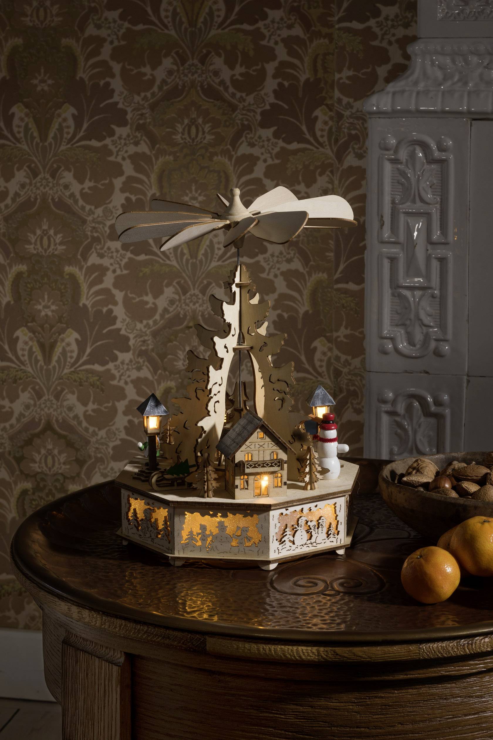 Plätzchenbacken, Kerzen anzünden, gemütliches Beisammen sein – die Vorweihnachtszeit hat für Groß und Klein, mit all Ihren Bräuchen und Traditionen, einen ganz besonderen Zauber. Das alljährliche Aufstellen dieser hochwertige LED Holzpyramide in Ihrem Zuhause könnte in Zukunft als festes Ritual dazugehören. Mit ihrer liebevollen und filigranen Ausarbeitung erzählt sie die Geschichte einer kleinen Weihnachtswelt. Was mag wohl hinter den erleuchteten Fenstern des nostalgischen Häuschens vor sich gehen? Die 8 warm-weißen Dioden und die sanft kreisenden Rotorblätter werden über einen USB-Anschluss mit einem Innentrafo betrieben, den Sie einfach an die Stromversorgung anschließen. Dabei verschwindet das transparente Kabel nahezu unsichtbar mit dem Hintergrund. Eine wunderschöne Advents-Dekoration an der Groß und Klein viel Freude haben werden – und dass alle Jahre wieder, denn mit den Qualitätsprodukten der Firma Konstsmide setzen Sie auf Ästhetik und Langlebigkeit.