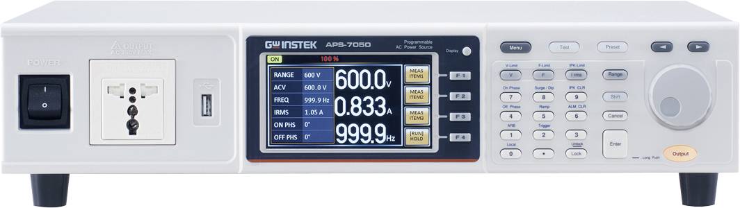APS-7000 ist eine Reihe von programmierbaren linearen AC-Labornetzgeräten, mit einer Höhe von 2 HE und dem Ausgangsfrequenzbereich von 45 – 500 Hz. Die maximale Nennleistung beträgt für APS-7050 500 VA, 310 Vrms, 4,2 Arms und APS-7100 1000 VA, 310 Vrms, 8,4 Arms. Optional kann auf die maximale Ausgangsspannung von 600 Vrms und die maximale Ausgangsfrequenz von 999,9 Hz sowie auf GPIB oder RS232/USB- Schnittstelle erweitert werden. Die APS-7000-Serie umfasst neun Mess- und Testfunktionen (Vrms, Irms, F, Ipk, W, VA, PF, Ipk hold, CF) und bietet eine Benutzeroberfläche, die der von AC Power Meter ähnlich ist.