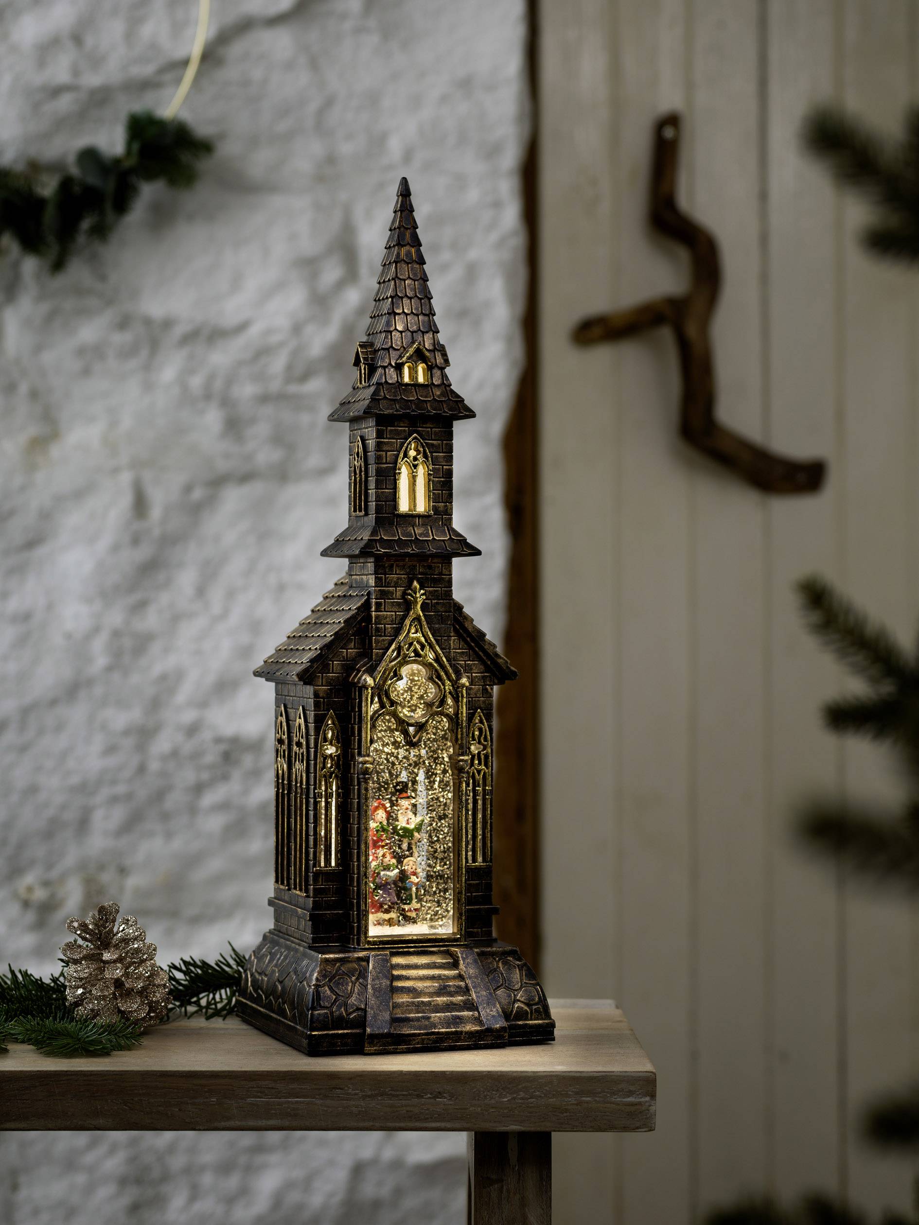 Let it Snow! Diese hochwertige, wassergefüllte Kirche verzaubert mit nostalgischem Schneeflockentanz. Nahezu schwerelos wirbelt die weißglitzernde Pracht um die romantische Weihnachtsszenerie und reflektiert das warm-weiße Licht der Diode. Der Anblick der Kirche macht das Herz weit und lässt uns Weihnachten wieder mit Kinderaugen sehen. Ein sehr hochwertiges und geschmackvoll gestaltetes Nostalgieobjekt, das einen ganz besonderen Platz in Ihrem Interieur verdient. Durch die Stromversorgung mit 3 C-Batterien müssen Sie bei der Platzwahl keine Kompromisse eingehen. Auch den 5h-Timer werden Sie schnell zu schätzen wissen, er sorgt dafür, dass das Licht abends automatisch nach 5 Stunden erlischt, um es am nächsten Abend wieder pünktlich für Sie aufleuchten zu lassen. Ein hochwertiges und langlebiges Markenprodukt, das Ihnen und Ihren Lieben viele Jahre Freude schenken wird. Die Firma Konstsmide ist seit 1942 auf die Herstellung hochwertiger Lichtdekorationen für den Innen- und Außenbereich spezialisiert und seit 1999 maßgeblicher Impulsgeber für innovative, langlebige und sichere LED-Lösungen.