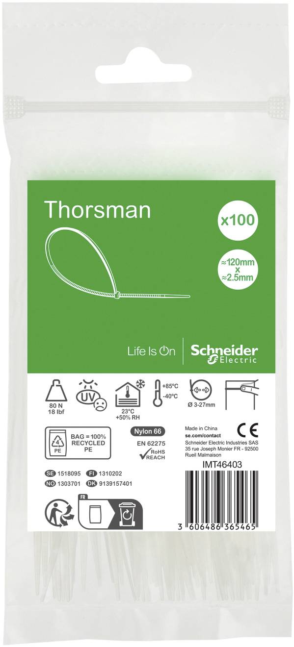 Thorsman-Kabelbinder von Schneider Electric ist 120 x 2,5 mm Kabelinstallationsmaterial. Kabelbinder werden für eine Vielzahl von Anwendungen verwendet, z.B. des Bündelns und Fixierens von Kabeln, Schläuchen und Schläuchen. Die Kabelbinder sind selbstsichernd. Die Kabelbinder haben glatte, abgerundete Kanten für eine einfache Handhabung und eine sicherere Installation. Die gebogene, abgerundete Spitze ermöglicht ein leichteres Einführen durch den Kopf des Kabelbinders. Der Bündeldurchmesser beträgt 3 mm bis 27 mm. Seine Schlaufenzugfestigkeit beträgt 80N / 18lbf. Die Abmessungen des Produkts betragen (L) 120 mm x (B) 2,5 mm x Dicke (T) 1,1 mm und das Produktgewicht beträgt 31 g. Es besteht aus PA (Polyamid) 6.6 und ist klar/farblos. Die Umgebungslufttemperatur für den Betrieb liegt zwischen -40 °C und +85 °C. Die Verpackung besteht zu 100 % aus recycelbarem Material und die Produktmenge beträgt 100 Stück in einem wiederverschließbaren Beutel mit Reißverschluss. Thorsman-Kabelzubehör wie Stecker und Hohlraumbefestigungen, Schrauben und Kabelflügel sind alle so konzipiert, dass sie maximale Ergebnisse liefern. Das Thorsman-Sortiment an Kabelgarnituren und -befestigungen bietet ein breites Angebot für alle Arten von Kundenbedürfnissen und deckt eine maximale Anzahl von Anwendungen, Flexibilität, Zuverlässigkeit und Leistung ab. Das Produkt entspricht der Norm IEC 60695-11-5 und ist feuerbeständig und verfügt über die Flammschutznorm UL 94 V2 (selbstverlöschend).