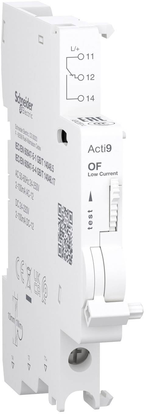 Dieses elektrische Zubehör von Acti9 ist ein Wechsler (Schließer/Öffner) zur Anzeige der Stellung OFFEN oder GESCHLOSSEN des Leistungsschutzschalters. Betriebsstrom liegt zwischen 2mA und 100mA bei einer Frequenz von 50Hz bis 60Hz bei 24VAC bis 240VAC & 24VDC bis 220VDC. Offen / Geschlossen, Hilfskontakt. Es hat 1 Positionsschalter mit Kontakten vom Typ 1 Wechslerkontakt. Für Installationen in kleinen Gewerbebetrieben, Gebäude, kritischer Infrastruktur, im Gesundheitswesen, in der Industrie, in Datenzentren vorgesehen. Dieses elektrische Zubehörist mit den Acti9-Reihen wie C120, C60H-DC, SW60-DC, C60PV-DC kompatibel. Die OF wird entweder für die Gerätekurzbezeichnung oder den Kompatibilitätscode verwendet. Schraubklemmenanschluss an der Unterseite. Der Anschluss erlaubt starre Kupferkabel. Der Kabelquerschnitt reicht von 0,5mm² bis 2,5mm². Schraubklemmenanschluss an der Unterseite. Der Anschluss erlaubt flexible Kupferkabel. Der Kabelquerschnitt 2 Kabel ermöglicht einen Kabelquerschnitt von 1,5mm². Er hat einen Schraubklemmanschluss an der Unterseite. Der Anschluss ermöglicht das flexible Verlegen von Kupferkabeln mit Aderendhülse (2 Kabel) mit einem Kabelquerschnitt von 1,5 mm². Die Bemessungsisolationsspannung Ui beträgt bis zu 500V. Die Bemessungsstoßspannung Uimp beträgt 4 kV. Es kann auf einer DIN-Schiene für die modulare Installation montiert werden. Die Breite im 9mm Raster ist 1. Die Abmessungen sind (B) 9 mm x (H) 85,3 mm x (T) 68 mm. Die Farbe des Produkts ist weiß. Das Produkt wiegt 30 g. Der Verschmutzungsgrad ist 3. Der Tropentauglichkeitsgrad ist Behandlung 2. Die Abisolierlänge beträgt 9 mm. Das Anzugsdrehmoment der Verbindung beträgt 1N.m (unten) für den Schraubendrehertyp PZ1. Der IP-Schutzgrad ist IP20. Die Betriebstemperatur liegt zwischen -25°C und +70°C. Die Lagertemperatur liegt zwischen -40°C und +85°C. Dieses Produkt erfüllt die Normen EN/IEC 60947-5-1, EN/IEC 60947-5-4, GB/T 14048.5 und GB/T 14048.17. Es hat EAC- und CCC-Gütesiegel und ist mit CE- und UKCA-Zertifikaten versehen.
