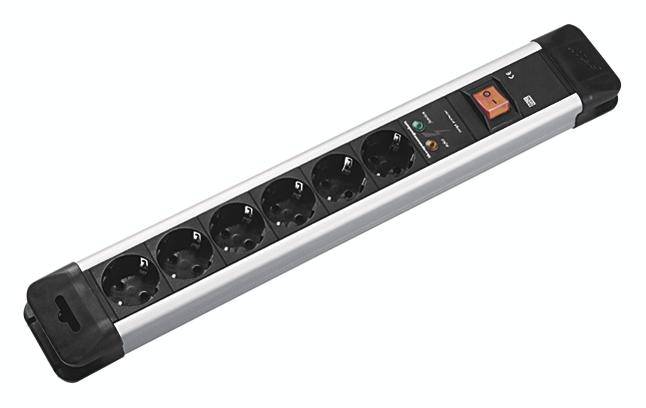 CONNECTUS Steckdosenleiste 6xUTE Steckdosen schwarz, Kunststoffprofil silber, schwarze Endkappen, mit erhohtem Beruhrungsschutz, Uberspannungsschutz mit Schalter mit 2-poligem Wippschalter 2.0m H05VV-F3G1,50mm? , schwarz