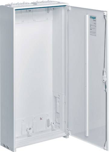 Schrankgehäuse nach DIN VDE 0603/1, Maßnorm DIN 43 870 zur Aufputz, Unterputz oder teilversenkter Montage. Zum Aufbau einer Zählerverteileranlage bis 355 A, Bemessungsspannung 230/400 V 50 Hz. Schutzart IP31 (IP44/IP54 nach DIN VDE 0470/1), Schutzklasse II schutzisoliert, Schutzart IP3X hinter der Tür. Bestehend aus Schrank mit Tür aus pulverbeschichtetem, eingebranntem, stabil profiliertem 1 mm dickem Stahlblech. Innenauskleidung komplett aus Kunststoff. Leitungseinführungen oben und unten durch eingebaute Kunststoffflanschplatten, rückseitige Vorprägung im Kunststoffteil und Sammelschienendurchführungen als beidseitige seitliche Vorprägung im unteren Bereich.