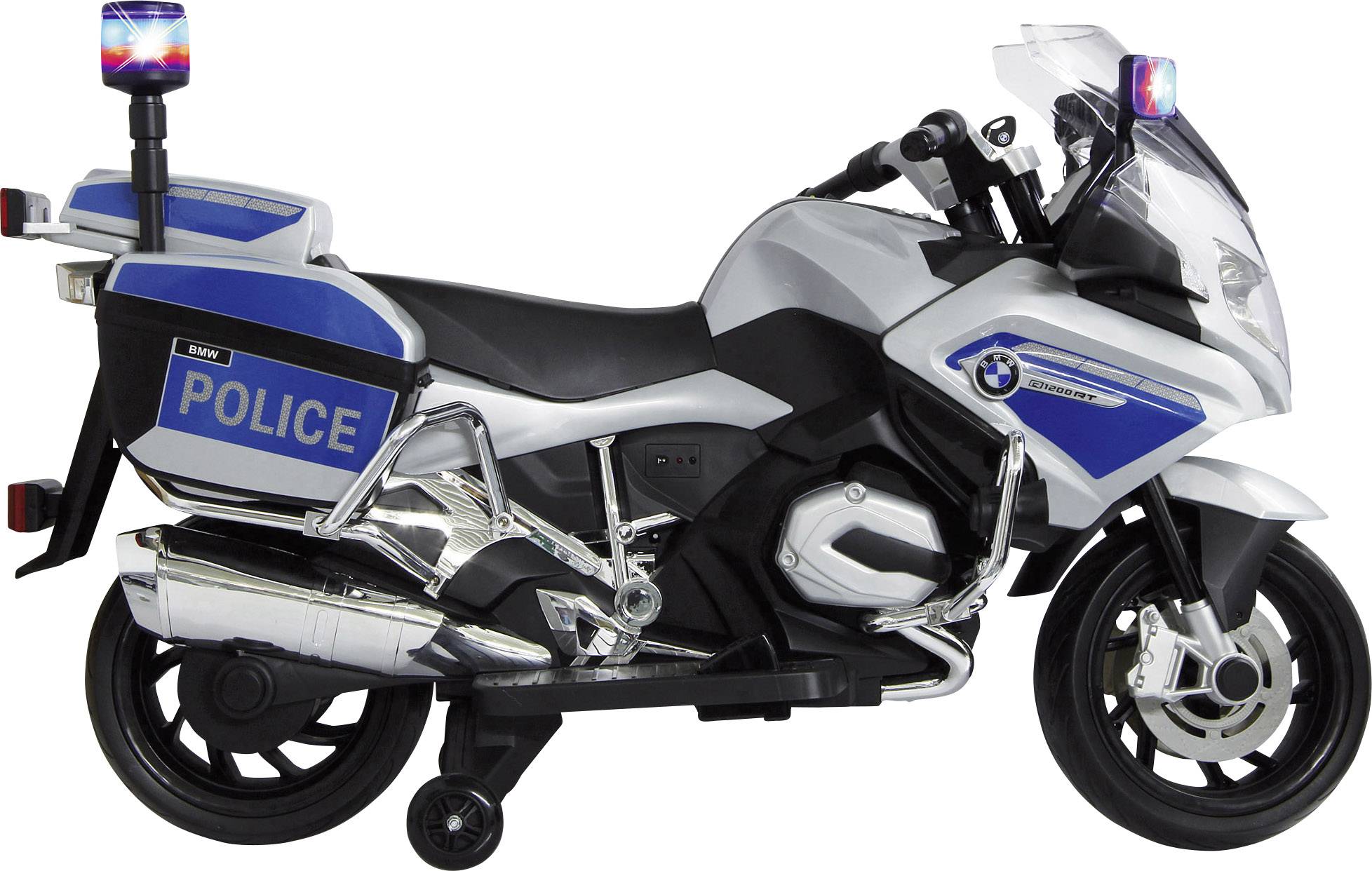Tatütata die Polizei ist da. Das offiziell lizensierte BMW R1200 RT Polizeimotorrad aus dem Hause JAMARA ist mit seinen vielen Details ein echter Hingucker. Schlüssel umdrehen, Motor starten und schon steht dem nächsten Einsatz nichts mehr im Wege. Der kraftvolle 12V Motor schaft mühelos jeden Wohnzimmerteppich oder die Hofeinfahrt vor Papas Garage in drei Geschwinfdigkeitsstufen – der leistungsstarke Akku verspricht über eine Stunde Fahrvergnügen. Echte Seitenkoffer mit großem Stauraum, LED Frontscheinwerfer, Signalleuchten, Sirene, Chrombügel und eine hochwertige Verarbeitung und Gesamtoptik. Alle dieses Features haben wir dem Original abgeschaut und somit steht dem Spielspaß nichts im Wege