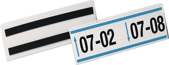 transparente PET-Hartfolie mit rückseitigen Magnetstreifen · Innenformat: 210 x 74 mm (B x H) · ideal für die Anwendung an metallischen Oberflächen wie z. B. Lagerregalen und Metallbehältern · scannertauglich und dokumentenecht · schneller Austausch der Einsteckschilder durch abgeschrägte Vorderkante · passende bedruckbare Einsteckschilder auf Anfrage erhältlich