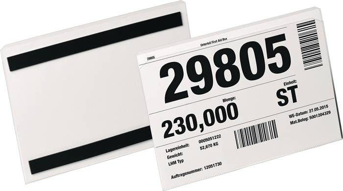 transparente PET-Hartfolie mit rückseitigen Magnetstreifen · Innenformat: A5 quer / 210 x 148 mm · ideal für die Anwendung an metallischen Oberflächen wie z. B. Lagerregalen und Metallbehältern · scannertauglich und dokumentenecht · schneller Austausch der Einsteckschilder durch abgeschrägte Vorderkante · passende bedruckbare Einsteckschilder auf Anfrage erhältlich