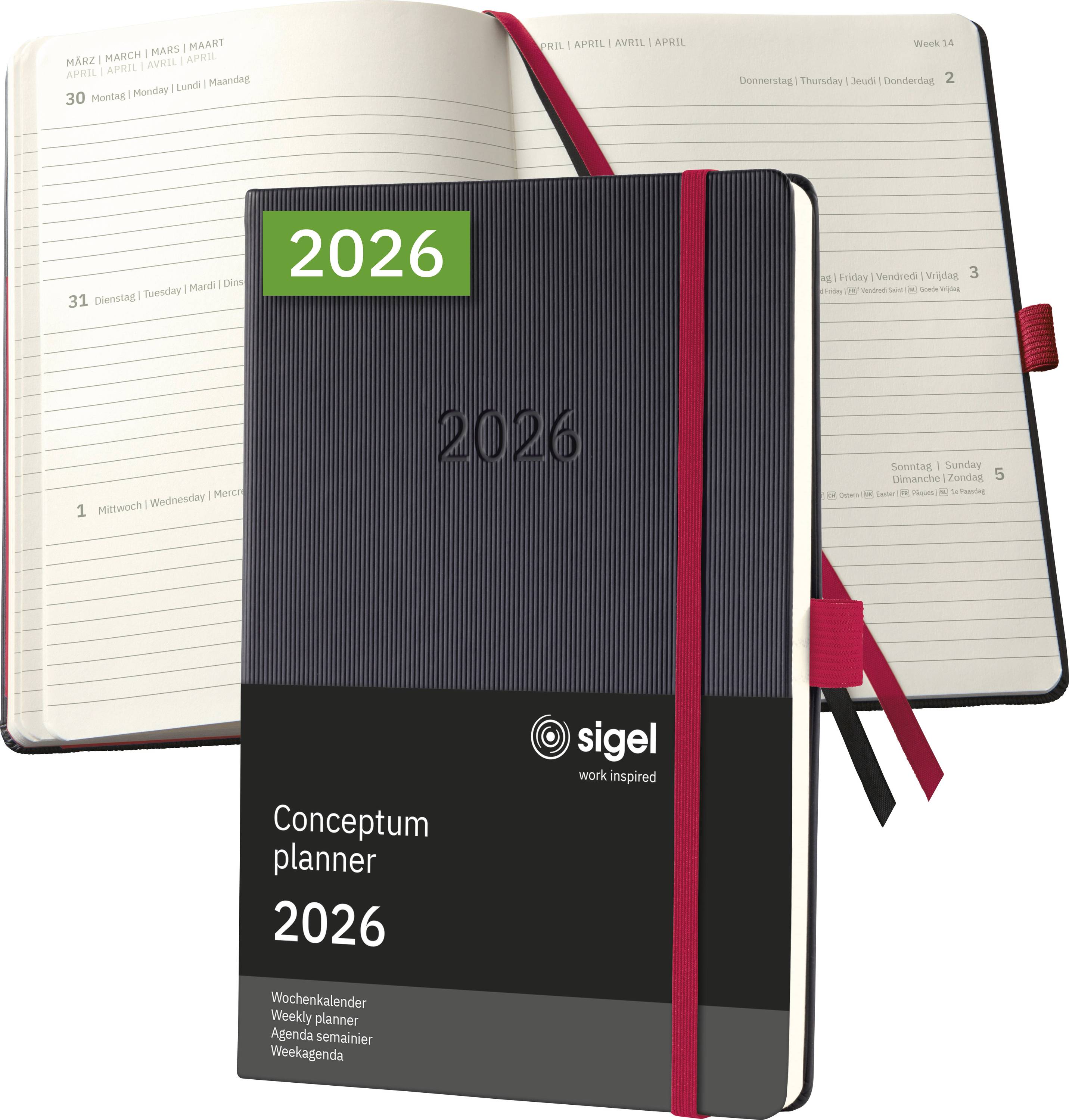 Immer stilsicher organisiert - mit dem eleganten Wochenkalender Conceptum für 2026 (Kalendarium: 2 Seiten = 1 Woche, DE/GB/FR/NL) im Format ca. A5 (14,80 x 21,30 x 2 cm) mit 192 Seiten (davon 18 Blätter perforiert)