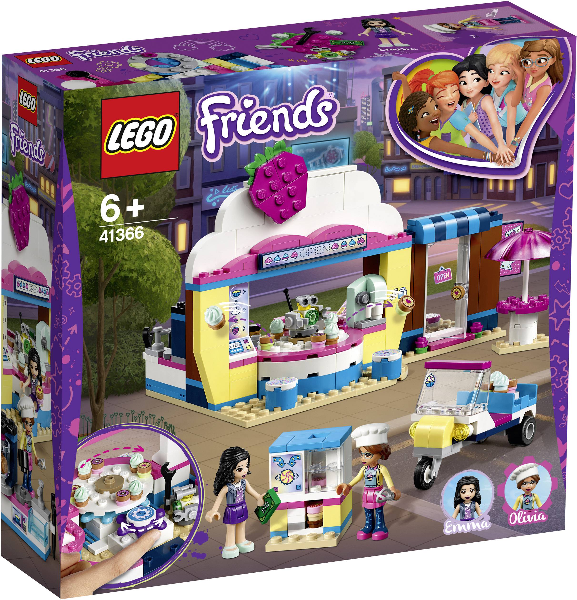 Das LEGO® Friends Set „Olivias Cupcake-Café“ (41366) kombiniert Technologie und Lebensmittel und bietet jede Menge supercoole Ausrüstung für fantasievolle Rollenspiele. Das Cupcake-Café hat wie die Sushi-Restaurants in Heartlake City ein Förderband, das sich mithilfe von Zahnrädern bewegt. Auch ein cooler Cupcake-Automat, Essensbereiche drinnen und draußen und eine Küche mit einem Backofen, einer Spüle und Backutensilien werden geboten. Für mehr kreatives Spielen umfasst dieses Café-Spielset darüber hinaus einen kleinen Roller, mit dem die Cupcakes in ganz Heartlake City verkauft werden können. Das Set enthält 2 Spielfiguren: Olivia und Emma sowie eine Roboterfigur.