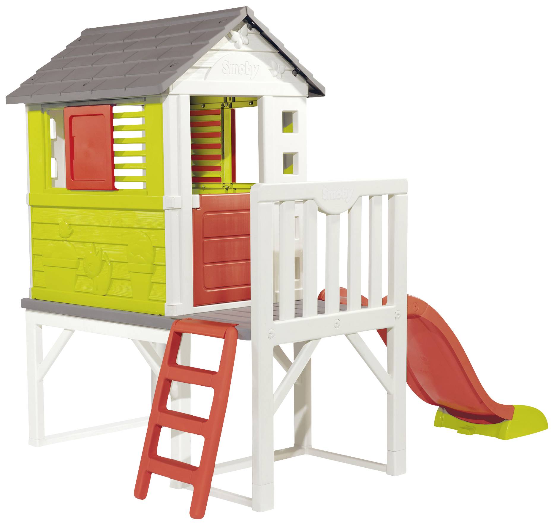 Mit dem neuen Stelzenhaus von Smoby können Kinder ihr erstes ganz eigenes Häuschen beziehen! Das Traumhaus für den Garten steht auf stabilen Pfählen und verfügt über eine Veranda, eine Kletterleiter und eine tolle Rutschbahn, mit der die Kleinen im Nu nach unten rutschen können. Dank des besonderen Fertigungsverfahrens ist dieses einzigartige Gartenhäuschen aus hochwertigem Kunststoff besonders stabil, im Vergleich zu Holzhäusern aber trotzdem leicht und einfach und schnell zu montieren. Die vier Seitenwände des Hauses sind detailreich gestaltet, Schmetterlinge und eine kleine Katze zieren die Fassade und geben ihm so ein lustiges Äußeres. Zwei Schiebefenster mit Lamellen zum Auf- und Zuschieben, ein kugelrundes Bullaugen-Fenster sowie eine kleine Eingangstüre ergänzen die kindgerechte Ausstattung dieses vielseitigen Spielhauses, das eine wirkliche Bereicherung im Garten von Mama und Papa ist. Das Stelzenhaus von Smoby ist aus UV-stabilem Kunststoff hergestellt und deshalb besonders widerstandsfähig gegen Wettereinflüsse und Ausbleichung. Die Rutsche hat eine Länge von 1,50 m.