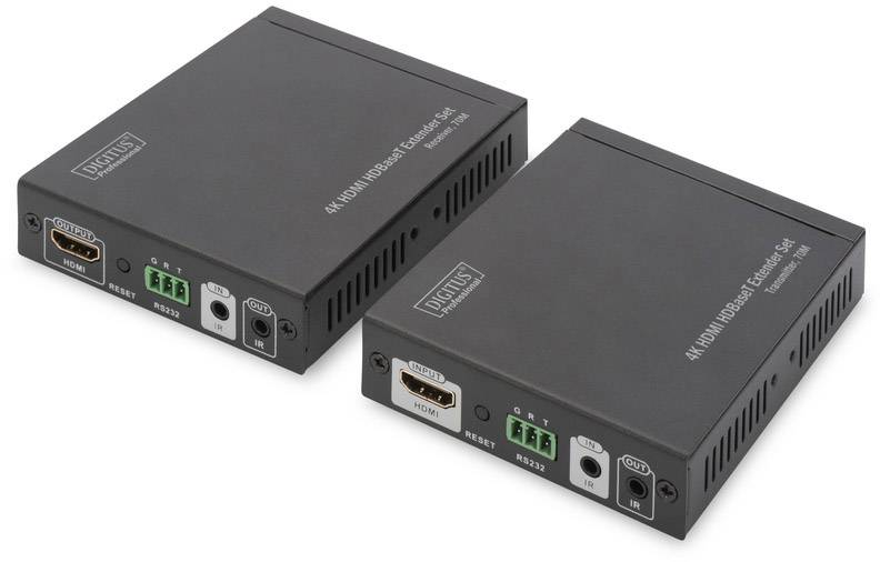 Der Digitus 4K Extender Kit, HDBaseT™, 4K / 60Hz bietet 70m für höchste Ansprüche - sowohl für hochauflösende Grafik als auch für absolut flüssige Videowiedergabe. Es überträgt digitale Video- und Audiosignale bis zu einer maximalen Länge von 70 m. HDMI-Signale (4K, 60Hz) können mit einem CAT 6-Netzwerkkabel bis zu 70 m übertragen werden. RS232-Steuersignale können daher bidirektional übertragen werden. Es besteht aus einem Sender sowie einer Empfängereinheit. Dank PoH-Unterstützung muss nur der Empfänger über das mitgelieferte Netzteil mit Strom versorgt werden. Das Paket enthält außerdem zwei bidirektionale Infraroteinheiten (Sender, Empfänger), die für die Fernsteuerung der angeschlossenen Eingangsquelle verwendet werden können.