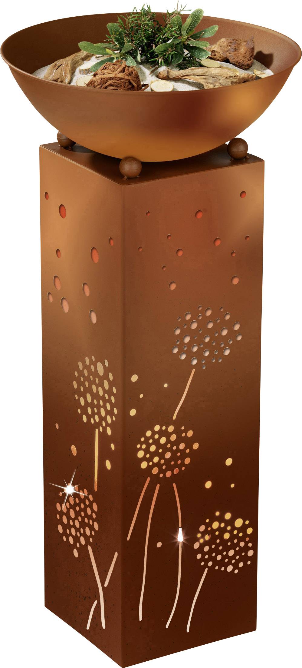 Die "EASYmaxx" Deko-Säule mit Pflanzschale ist mit ihrem angesagten Rost-Look und dem feinen Pusteblumen-Design ein echter Hingucker für jedes Ambiente. Mit der zuschaltbaren LED-Beleuchtung fasziniert das imposante Deko-Element im Dunkeln sogar noch mehr. Batteriebetrieb, unabhängig von Steckdosen und nahezu überall platzierbar. Für den Innen- und Außenbereich geeignet - ideal für Garten, Terrasse und Balkon. Mit intergrierter Timerfunktion für autmatisches Abschalten nach 6 Stunden.