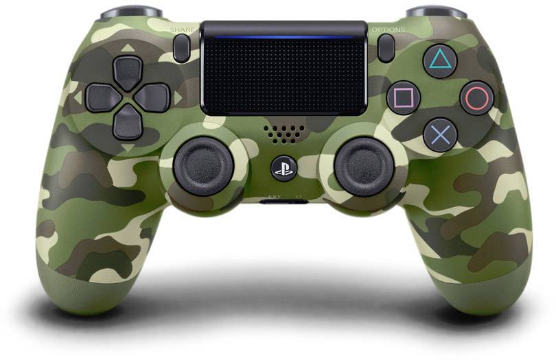 Sony DualShock 4. Gerätetyp: Gamepad, Unterstützte Gamingplattformen: PlayStation 4, Gaming-Kontrolltechnologie: Analog / Digital. Übertragungstechnik: Kabellos, Geräteschnittstelle: Bluetooth, Bluetooth-Version: 2.1+EDR. Batteriekapazität: 1000 mAh, Akku-/Batterietyp: Lithium-Ion (Li-Ion). Produktfarbe: Camouflage, Grün. Gewicht: 210 g, Breite: 162 mm, Tiefe: 52 mm