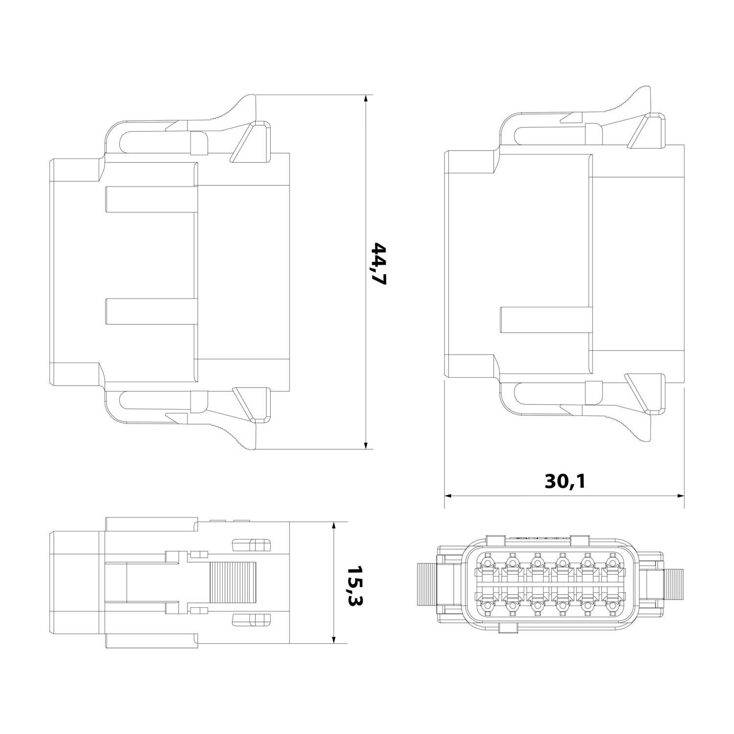 ATM06-12SA Amphenol AS-12SF 114 Kabeldose ATM-Serie Buchse, Kodierung A, 12-polig, Crimpanschluss Isolationsdurchmesser 1,35mm - 3,05mm, Kontaktgröße size 20: Typ: Kabeldose ATM-Serie Bauart: Buchse Kontaktgröße: size 20 Anschlusstechnik: Crimpanschluss Polzahl: 12 Kodierung: A Beschriftung: 1 - 12 Bemessungsspannung: 250V Bemessungsstrom: 7,5A Isolationswiderstand: min. 1 Gigaohm bei 25°C Querschnitt: mm²: 0,34mm² - 1,5mm² AWG: AWG22 - AWG16 Passend für Aderdurchmesser: Isolationsdurchmesser: 1,35mm - 3,05mm Maße: Länge: 30,1mm Breite: 44,7mm Höhe: 15,3mm Temperaturbereich: -55°C bis 125°C Steckzyklen: >=100 Schutzart: IP67 Werkstoff: Gehäuse: Thermoplastischer Kunststoff Dichtung: Silikon Elastomer Farbe: Gehäuse: grau Dichtung: orange Merkmale: - Das Steckverbinder-Design verfügt über ein integriertes Verriegelungssystem. Umgebung: -UV-beständig Übereinstimmende Angaben: ATM-Serie bis 7,5 Ampere, 2 bis 12-polig, Amphenol Stecker