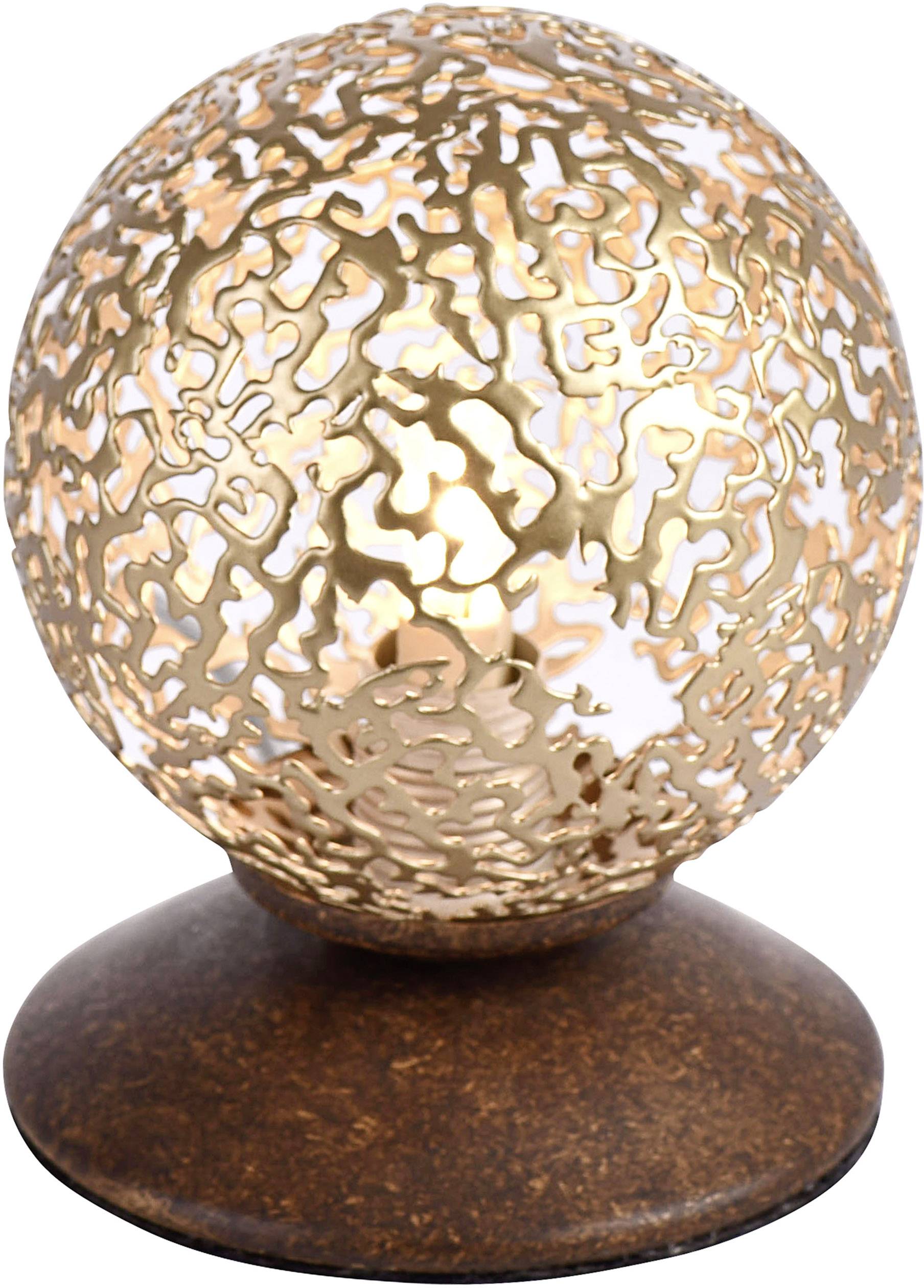 Die formschöne Tischleuchte lässt Ihre Wohnräume warm erstrahlen. Die Kombination aus braun, lackierten Stahl und der goldfarbigen Leuchtkugel mit hübschen, lichtdurchlässigen Muster gibt der Leuchte das gewisse Etwas. Die Tischleuchte ist mit einem Schnurschalter ausgestattet über den Sie die Leuchte bequem ein- und ausschalten können. Sie wird ohne Leuchtmittel geliefert. Sie haben die Möglichkeit die Leuchte mit einem G9-Leuchtmittel bis max. 40 Watt zu bestücken. Kombinieren Sie die Tischleuchte mit einem Leuchtmittel ganz nach Ihrem Geschmack. Die Tischleuchte gibt durch die goldene Leuchtkugel nicht nur ein schönes Lichtspiel wieder sondern erfüllt auch einen absoluten, dekorativen Zweck.
