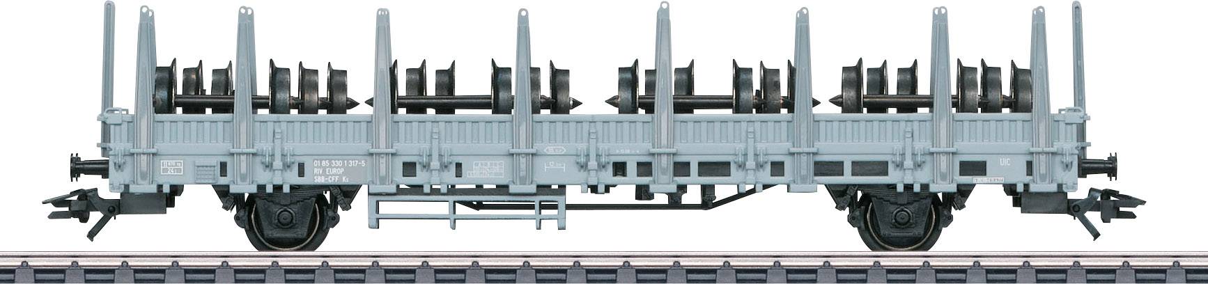 2-achsiger Rungenwagen Bauart Ks, mit niedrigen Bordwänden und Steckrungen, ohne Bremserbühne. Silbergraue Grundfarbgebung. Schweizerische Bundesbahnen (SBB). Betriebszustand Ende 1970er-Jahre.