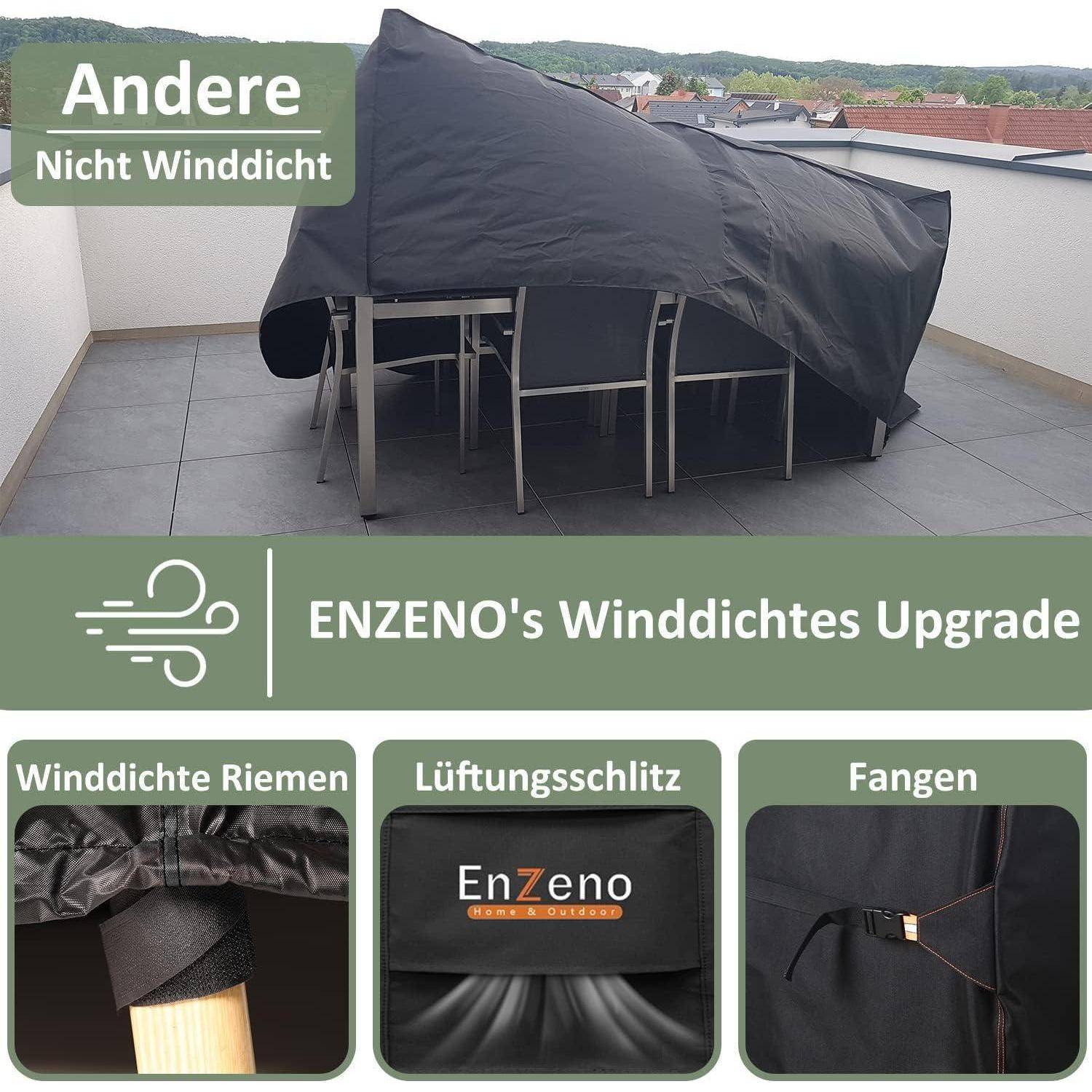 Stell dir vor, wie du an warmen Abenden im Garten sitzt, die Abdeckung schützt deine Möbel vor Regen, Staub und UV-Einwirkung – damit du jederzeit bereit bist, mit Familie und Freunden das Wetter zu genießen. Die strapazierfähige Abdeckung aus schwerem Oxford-Tuch mit PU-Beschichtung schützt vor Wasser, Kratzern und Rost und bewahrt Farb- und Formtreue über Jahre. Falls du doch einmal Fragen hast, ist der Enzeno engagierte Kundendienst dein Ansprechpartner: Wenn du mit dem gekauften Produkt nicht zufrieden bist, kontaktiere uns bitte. Wir antworten innerhalb von 24 Stunden; du findest deine Bestellung