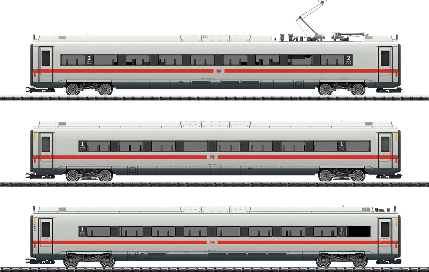 3-teilige Ergänzung der Grundgarnitur zum ICE 4 im Längenmaßstab 1:95. Spezial-Kurzkupplungen mit Kulissenführung. Serienmäßig eingebaute LED-Innenbeleuchtung. Die Innenbeleuchtung wird versorgt über die durchgehende elektrische Verbindung des ganzen Zuges und ist nur funktionsfähig und digital schaltbar im Verbund mit der Grundgarnitur. Beide Pantographen auf einem Mittelwagen sind nur im Verbund mit der Grundgarnitur über den Decoder als Digital-Funktion separat heb- und senkbar. Gesamtlänge 90,5 cm.