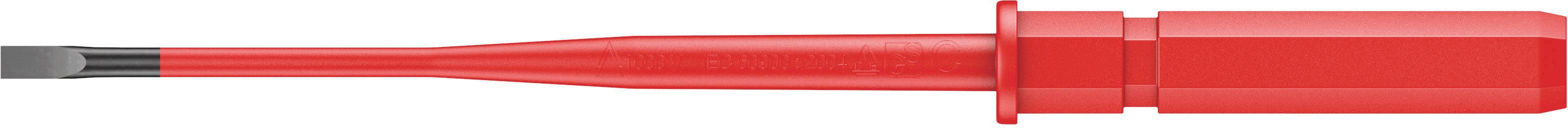 Wechselklinge mit reduziertem Klingendurchmesser mit integrierter Schutzisolation, so können tiefliegende Schraub- und Federelemente erreicht und betätigt werden. Stückgeprüfte Werkzeuge gem. IEC 60900. Stückprüfung im Wasserbad bei 10.000 V für sicheres Arbeiten bei der zugelassenen Spannung von 1.000 V.