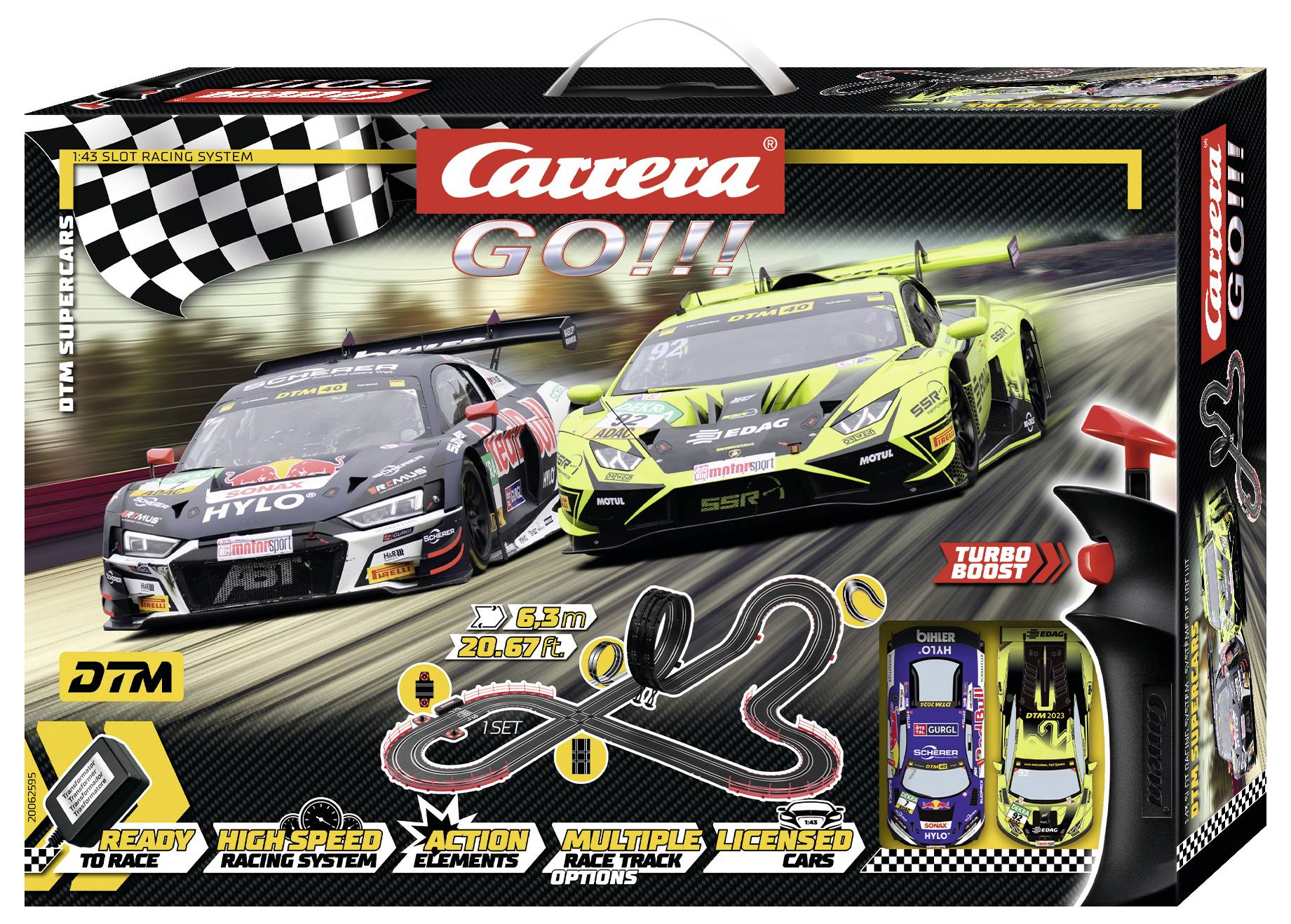 Das Carrera GO!!! Set „DTM Supercars“ bringt die packende Welt der DTM direkt nach Hause: Auf der 6,3 Meter langen Strecke treten der Audi R8 LMS GT3 Evo II DTM „R. Feller, No.7“ und der Lamborghini Huracán GT3 Evo II „Mirko Bortolotti, No.92“ gegeneinander an. Beide Supercars, im Maßstab 1:43, liefern sich atemberaubende Duelle auf einer Rennstrecke mit Looping, Fly-Over, Kreuzung und kniffligen Kurven. Der Turbo-Handregler sorgt für den perfekten Speed, während präzise Steuerung und packende Manöver in engen Passagen das Racing-Feeling intensivieren. Ob auf den langen Geraden oder im rasanten Looping, dieses Set bringt jede Menge Nervenkitzel und authentische Rennsport-Action in die Carrera GO!!! Welt.