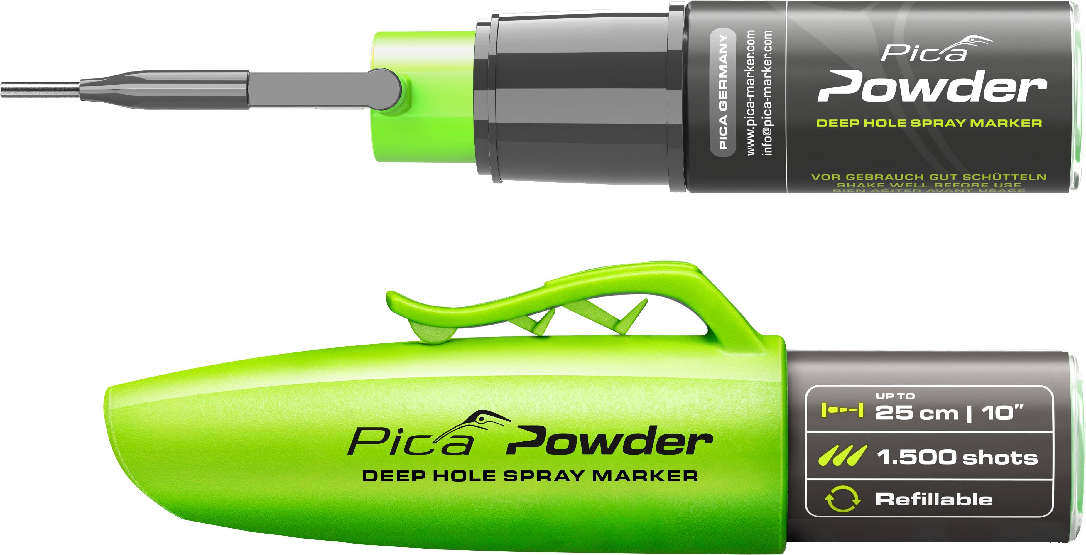 Der Pica Powder Deep Hole Spray Marker ist die schnelle und präzise Lösung zum kontaktlosen Markieren durch Bohrlöcher bis 25 cm Tiefe. Dank grün-fluoreszierender Kreide haftet die Markierung auf allen Oberflächen – ob trocken, feucht, rau oder glatt – und lässt sich von glatten Flächen leicht entfernen. Der 360°-Sprüharm erreicht auch schwer zugängliche Stellen. Für alle Bohrlochgrößen ab 3 mm geeignet. Features: - Für kontaktloses Markieren - Grün-fluoreszierende Punktmarkierung auf Kreidebasis - Bis zu 1.500 Schuss Lebensdauer - Für alle Bohrlochgrößen ab 3 mm - 360° Sprüharm für schwer erreichbare Stellen - Mit effektivem Staub- und Nässeschutz - Ideal für Holz-, Elektro-, Sanitär- & Bauarbeiten - Haftet auf allen Oberflächen – trocken, feucht, rau, glatt etc. - Leicht von glatten Flächen entfernbar Lieferumfang: - 1x Spraymarker