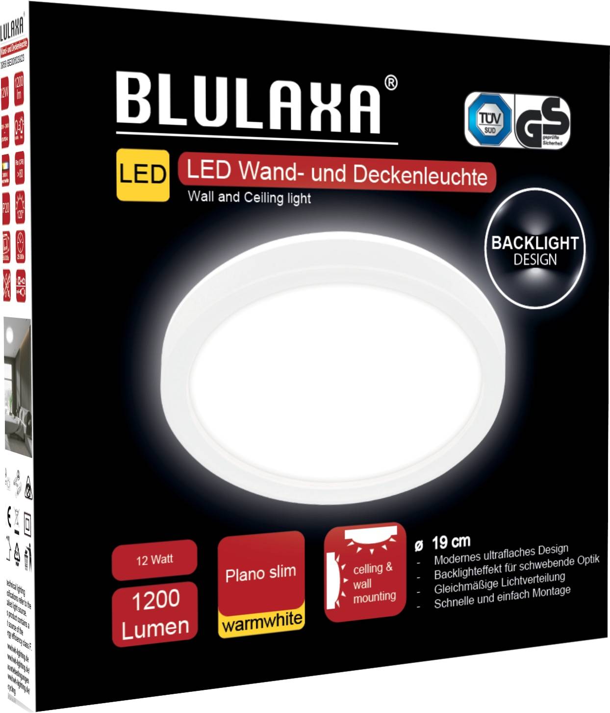 Die flache „Ultraslim“ LED-Wand- und Deckenleuchte Plano slim der Marke BLULAXA besticht durch ein zeitloses und modernes Design mit weißem Ring und flacher Bauform von nur 2,8cm. Der Backlight Effekt unterstreicht die schwebende Optik und wirkt dabei modern und fügt sich ideal in Ihren Raum ein. Die Lichtverteilung mit der warmweißen Lichtfarbe ist gleichmäßig und ohne störende Schattenbildung. Auch die Montage gestaltet sich einfach und unkompliziert Dank der Schnellklemme mit Drehverschluss. Der Durchmesser der Leuchte beträgt 19 cm. Features: - Flaches Design mit nur 2,8 cm Bauhöhe - Backlight-Effekt für moderne, schwebende Optik - Einfache Montage dank Schnellklemme mit Drehverschluss - Gleichmäßige Lichtverteilung ohne Schattenbildung - Langlebig mit 25.000 Stunden Lebensdauer Technische Daten: - Leistung: 12 W - Farbtemperatur: 3000 K (warmweiß) - Lichtstrom: 1200 lm - Lichtausbeute: 100 lm/W - Betriebsspannung: 240 V - Schutzart: IP20 - Farbe: Weiß - Dimmbar: Nein - Schaltzyklen: 50.000 - Lebensdauer: 25.000 h - Produkt enthält eine Lichtquelle der Energieeffizienzklasse F (EEK-Spektrum A – G) - Betriebstemperatur: -25... +45 °C - Durchmesser: 190 mm Lieferumfang: - 1x LED-Deckenleuchte - 1x Betriebsanleitung