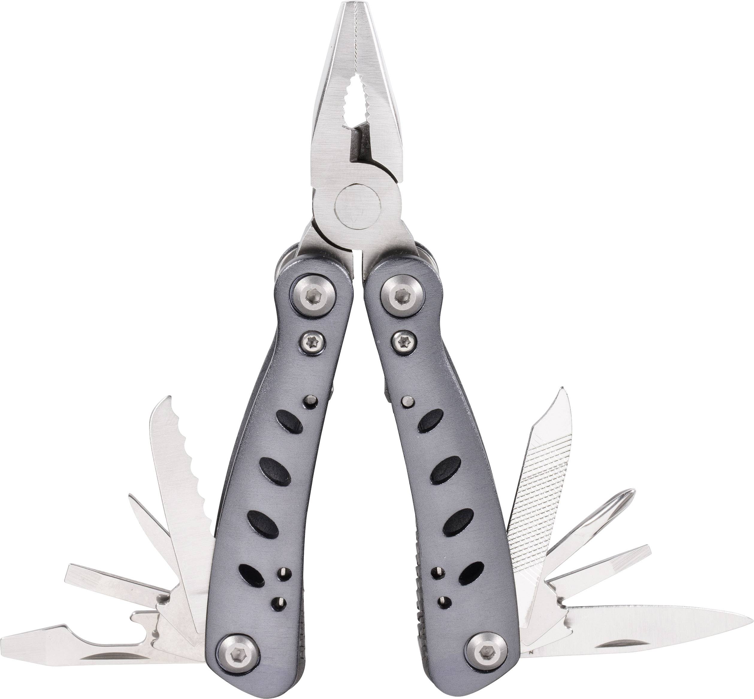 Das Multitool ist mit einer Schenkellänge von gerade mal 71 mm so kompakt, dass es auch bequem in der Hosentasche getragen werden kann. Das schicke Mini-Tool bietet neben der Zange auch eine Klinge, Feile, Säge und diverse Schraubendreher. Die Heftschalen sind aus grauem Aluminium.