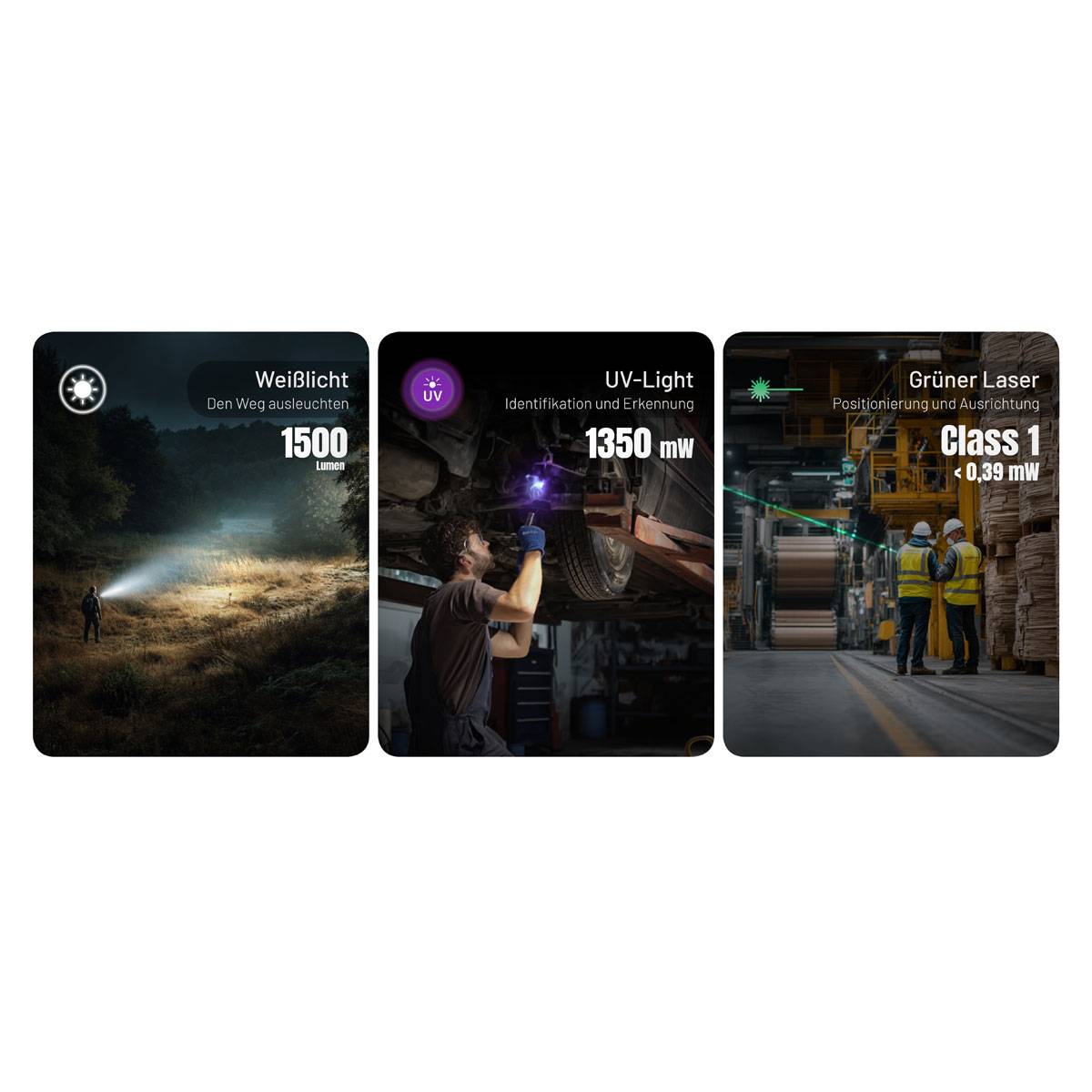 - bietet Weißlicht, UV-Licht und grünen Laser in einem ultrakompakten Tool