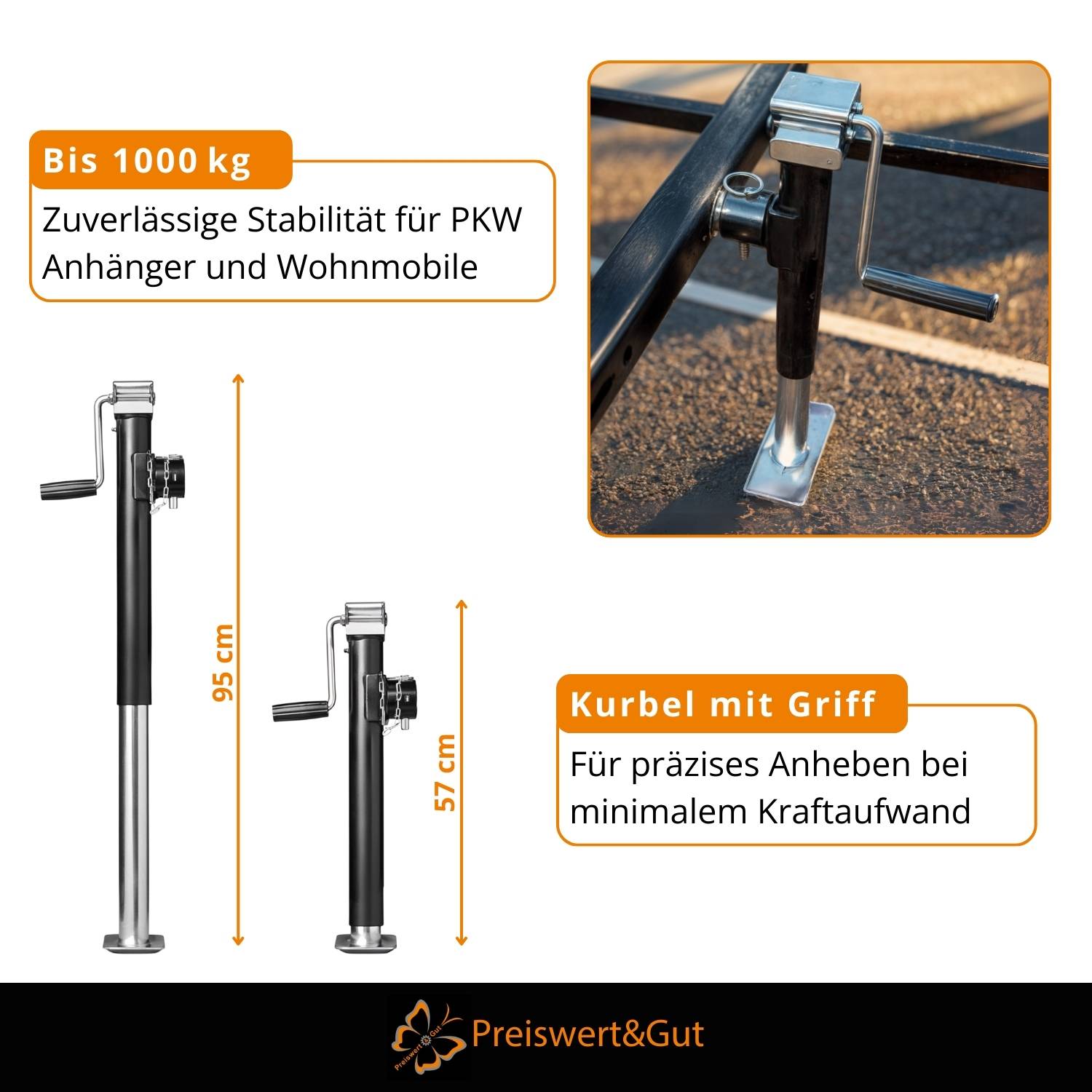 Die Ausdrehstützen bieten eine beeindruckende maximale Tragfähigkeit, die bis zu 1000 kg beträgt. Dadurch sind sie ideal geeignet für PKWs, landwirtschaftliche Anhänger, Trailer und Wohnmobile. Eine flexible Höhenverstellung macht diese Stützen zu einer praktischen Lösung, da sie von 57 cm bis 95 cm einstellbar sind und somit für zahlreiche Einsatzmöglichkeiten dienen können.
