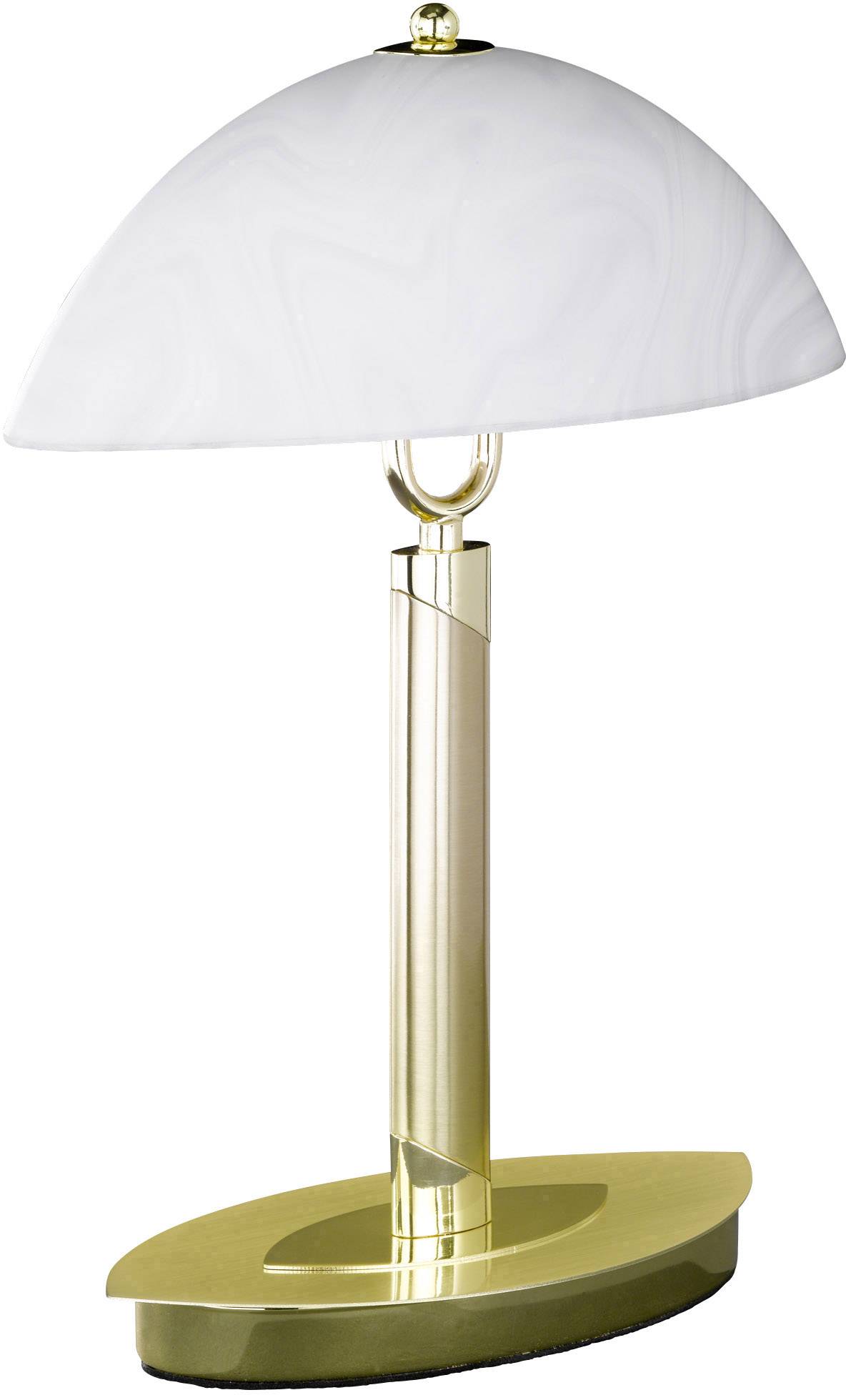 Der ovalförmige, satinierte Glasschirm filtert das Licht sanft und sorgt so für eine angenehme Atmosphäre. Die messingfarbene Tischlampe hat einen Schalter.