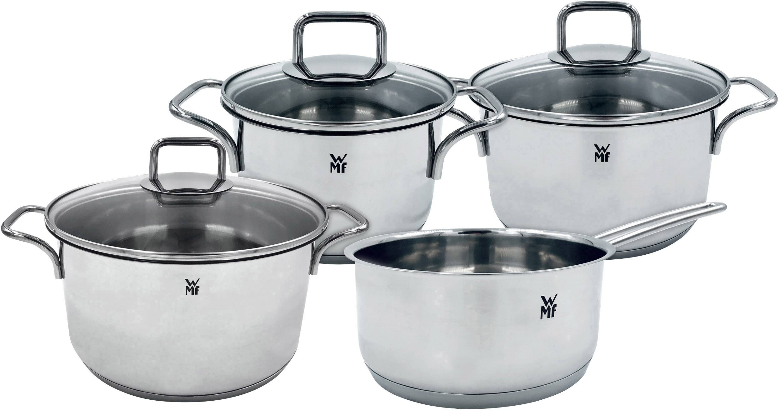 1x Fleischtopf mit Deckel Ø 16 cm + 1x Fleischtopf mit Deckel Ø 20 cm + 1x Fleischtopf mit Deckel Ø 24 cm + 1x Stielkasserolle ohne Deckel Ø 16 cm.