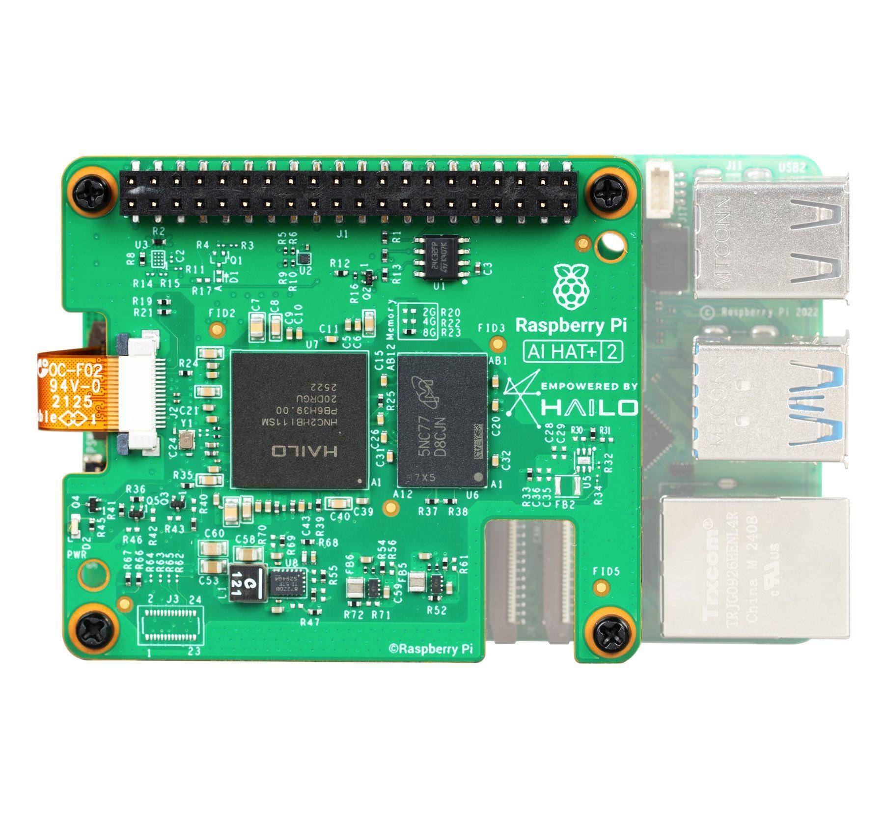 Das Raspberry Pi AI HAT+ 2 ist eine Erweiterungsplatine, die auf dem Hailo-10H AI-Beschleuniger basiert und generative KI-Fähigkeiten zum Raspberry Pi 5 bringt. Mit 8 GB dediziertem Onboard-RAM ist der AI HAT+ 2 ideal, um große Sprachmodelle und visuelle Sprachmodelle lokal auszuführen, wodurch dem Raspberry Pi 5 andere Aufgaben überlassen werden. Der AI HAT+ 2 bietet zuverlässige, latenzarme, beschleunigte generative KI am Edge und ist daher die perfekte Wahl für Anwendungen wie Offline-Prozesssteuerung, sichere Datenanalyse, Facility Management und Robotik.