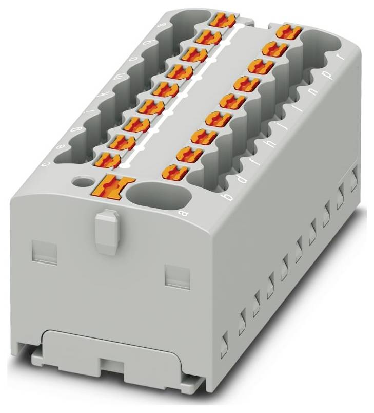 Verteilerblock, Grundklemme mit Einspeisung, Nennspannung: 450 V, Nennstrom: 17,5 A, Anzahl der Anschlüsse: 19, Abgriff, Querschnitt: 0,14 mm² - 2,5 mm², Push-in-Anschluss, Sammelanschluss, Bemessungsquerschnitt: 4 mm², Querschnitt: 0,2 mm² - 6 mm², Montageart: kleben, Farbe: grau
