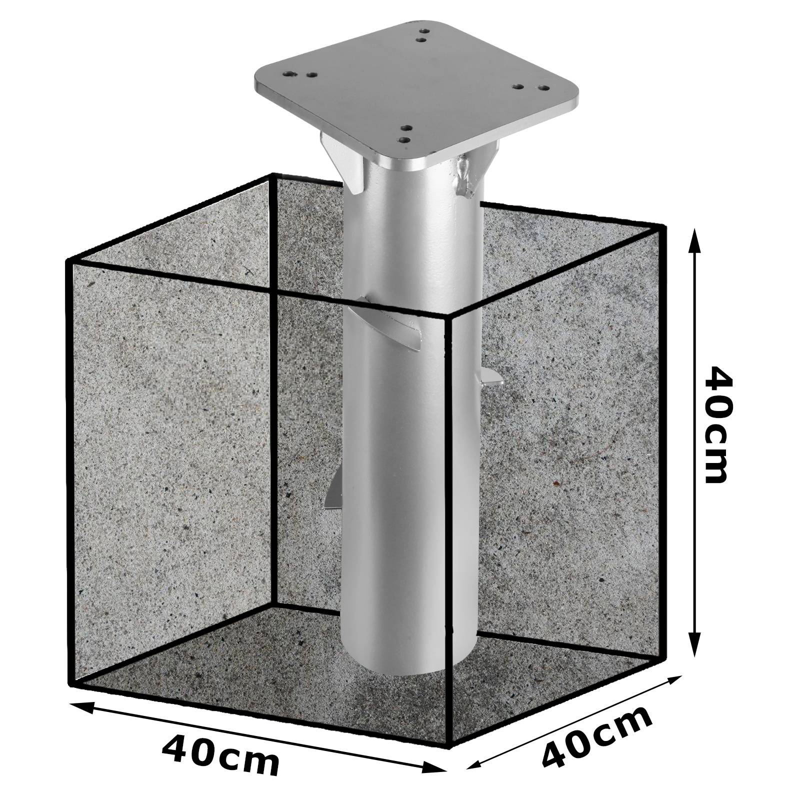 Die Montage dieses Sonnenschirmständers ist unkompliziert. Der Ständer wird einbetoniert und benötigt eine Bodenfläche von mindestens 40 x 40 x 40 cm. Die Montageplatte misst ca. 16 x 16 cm und hat eine Gesamthöhe von etwa 40 cm. Mit der beiliegenden